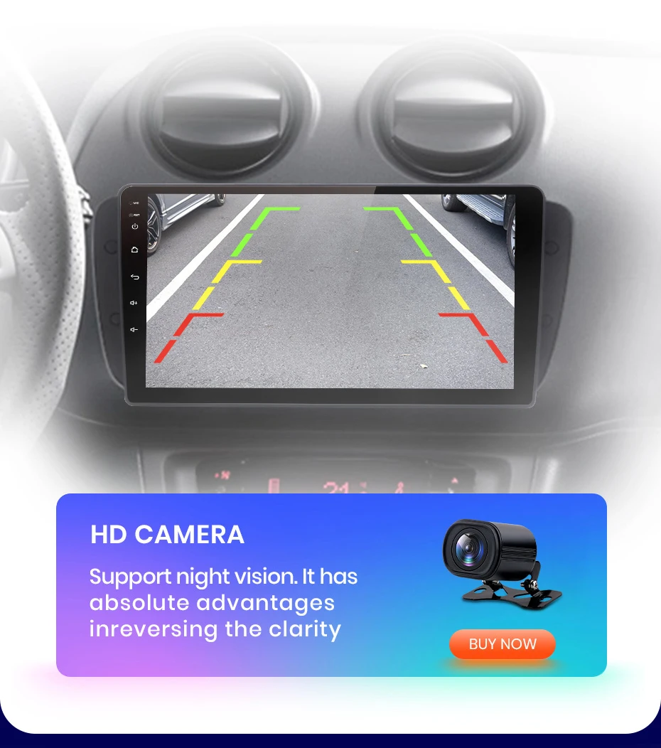 Когда автомобиль переключается на обратную передачу, экран автоматически переключается на задний вид с помощью парковочных линий, помогает вам изменить или припарковать автомобиль.(Задняя камера на изображении ниже является необязательной, и она лучше, чем обычная.)