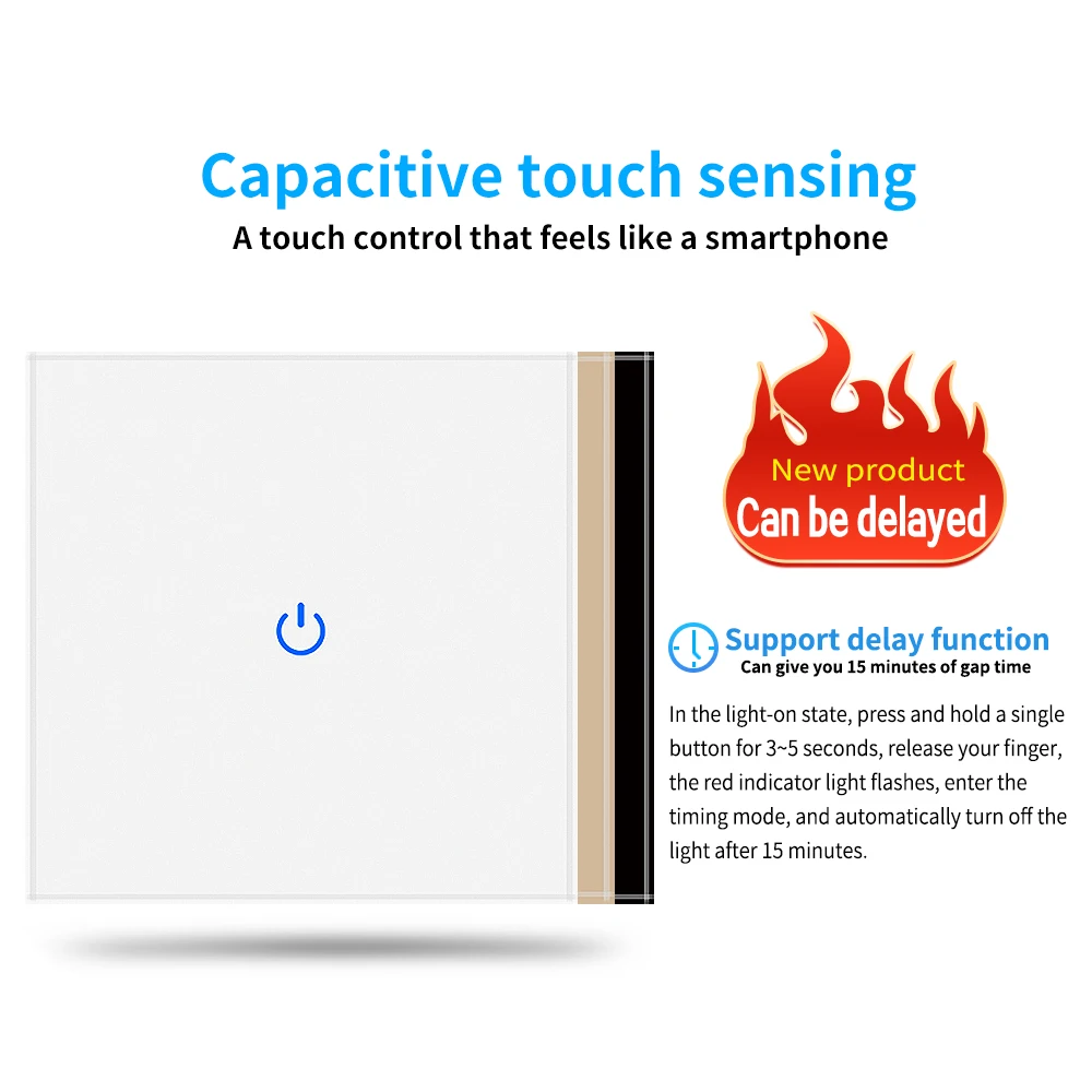Сенсорный выключатель из закаленного стеклаСтандарт ЕСМощность нагрузки: нормальный 5-300 Вт/светодиод: 5-150 Вт/комплектЗадержка 15 минут выключения