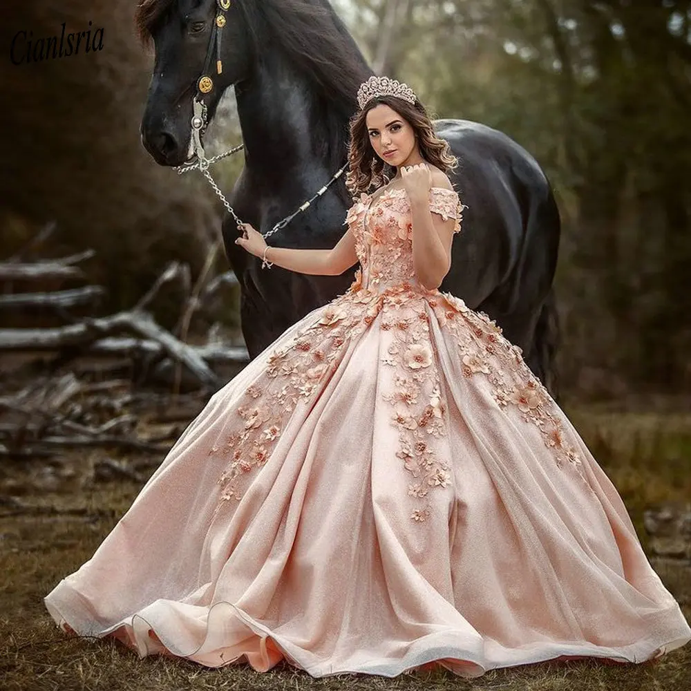 Блестящее розовое Золотое бальное платье с открытыми плечами, платье Quinceanera с цветочной аппликацией ручной работы, милые платья для выпускного вечера 15