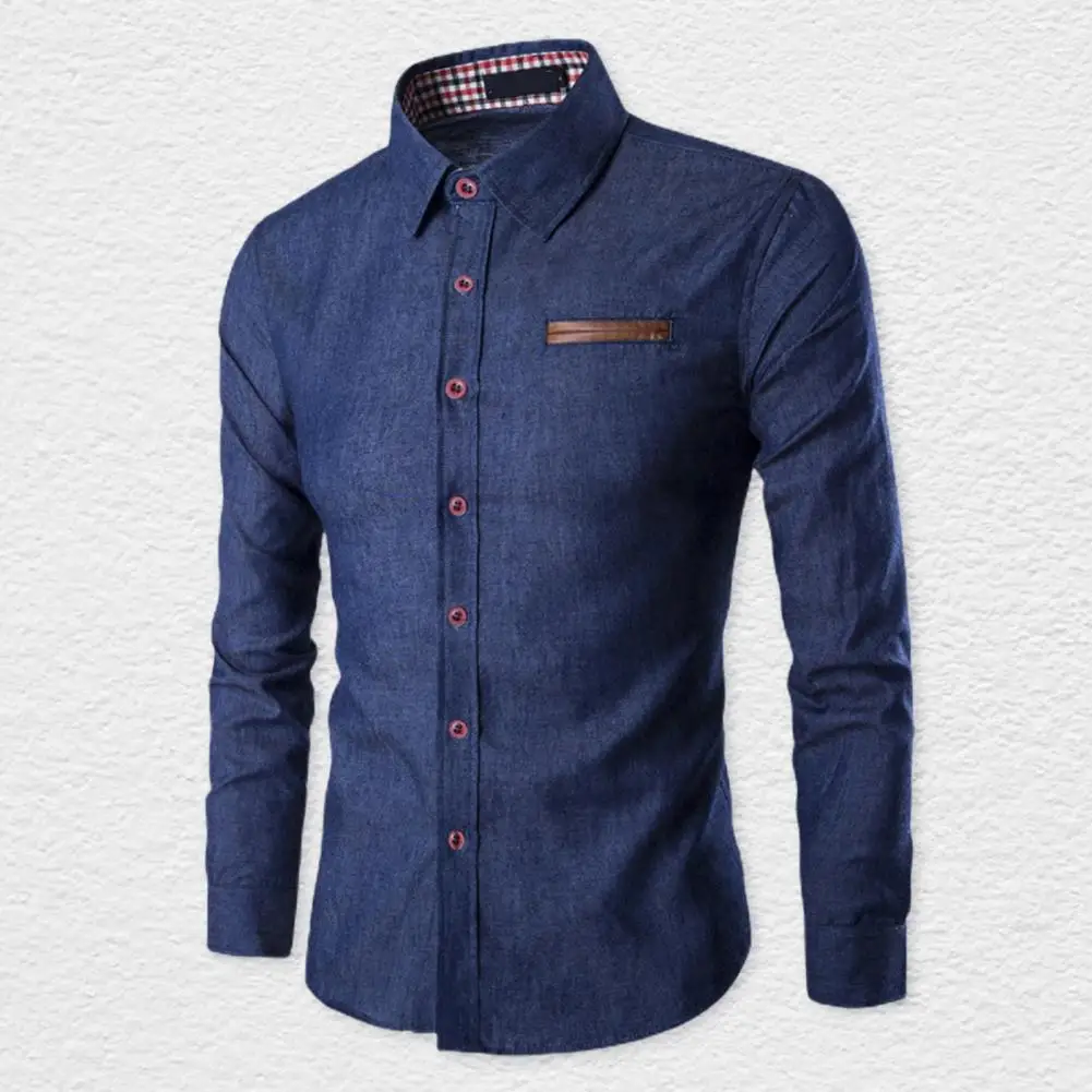 Мужская джинсовая рубашка с длинным рукавом, голубая однобортная приталенная Повседневная рубашка с лацканами, весна-осень