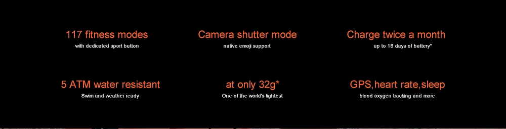 Спорт: 17 спортивных режимов (открытый бег, беговая дорожка, Открытый Велоспорт, крытый Велоспорт, фристайл, прогулки, треккинг, беговая дорожка, бассейн, Открытый плавательный бассейн, крикет)
