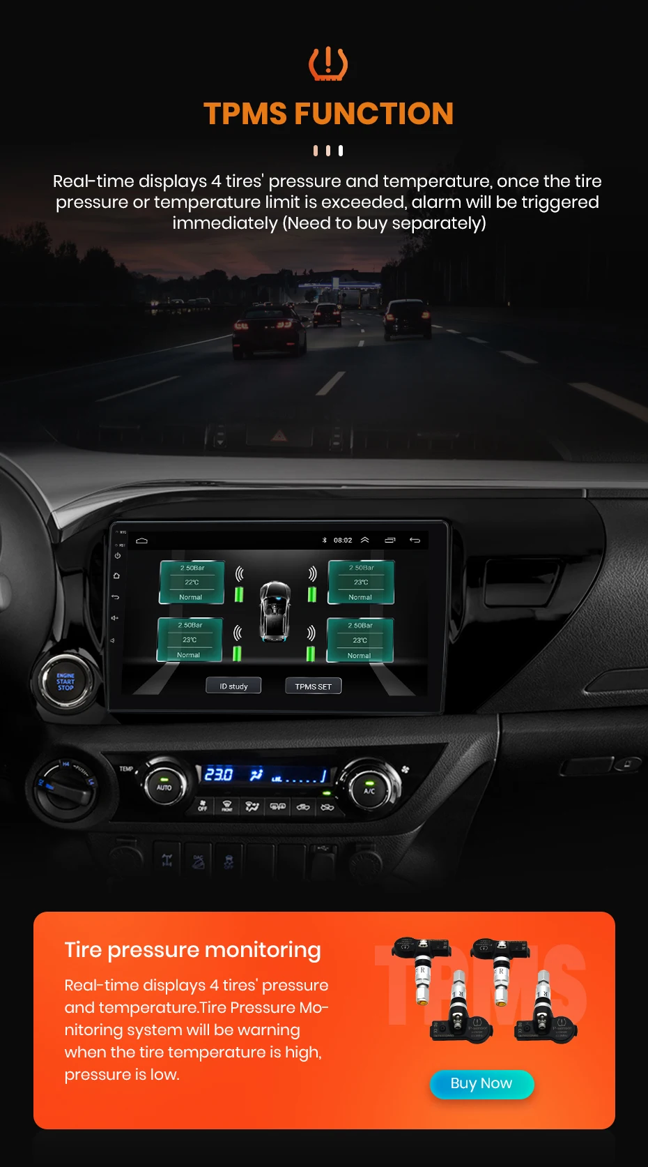 > Отображает 4 давления и температуры в режиме реального времени. Как только давление или температура в шинах будут необычными, сразу же будет сигнал тревоги.
