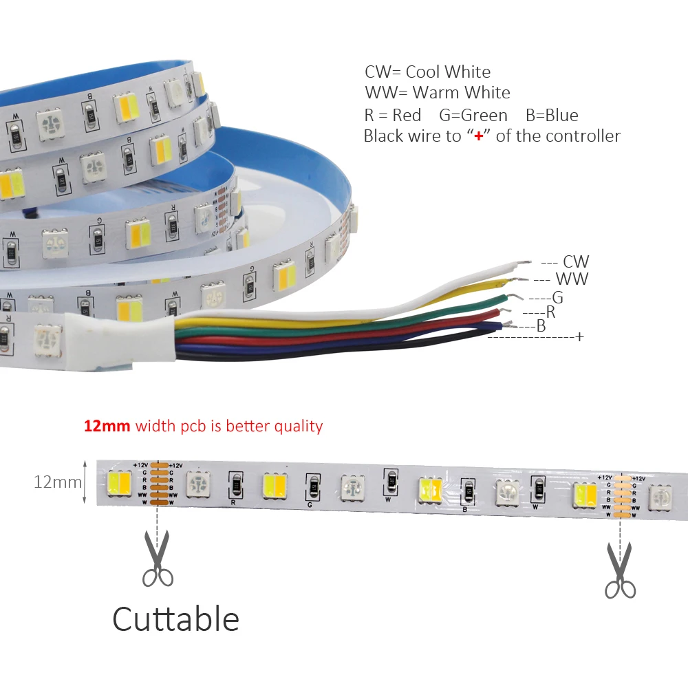 Светодиодный Тип: 5050 SMDКоличество СВЕТОДИОДНЫЙ: 60 светодиодный s/метрМощность: 7,2 Вт/мСветодиодный цвет: RGB + холодный белый (6000-6500K)+ теплый белый (2700-3000K)Рабочее напряжение: 12 В постоянного токаСтепень защиты: IP20 (не водонепроницаемый); IP65 (эпоксидная смола водонепроницаемый)Размер: 5000 мм * 12 мм * 2,5 мм (IP20 не водонепроницаемый) 5000 мм * 12 мм * 4 мм (IP65 Водонепроницаемый)Угол луча: 120 °Посылка включает в себя: 5 метров/рулонОсобенности:Сверхяркий 5050SMD светодиодный, высокая интенсивность и надежность.Непрерывная длина, упаковано с 5 метром в катушке, каждая катушка является продажным блоком.Срезаем каждые 6 светодиодов по разрезающим знакам в соответствии с практическими требованиями.Длительный срок службы 50000 + часовГибкая лента для изгибаПолностью гладкий и ровный светильник, решение неровной светящейся проблемыУльтра-яркий, но работает при низкой температуреСамоклеящаяся задняя сторона с 3 м двусторонней клейкой лентойСертификация: CE & RoHSНизкое энергопотребление