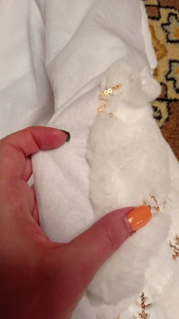 коврик под ёлку просто великолепный. Качество просто на высшем уровне) Качественное и аккуратное исполнение, пайетки не цепляются. Пушистая часть коврика очень мягкая, как плед. Результат превзошёл мои ожидания, денег своих стоит