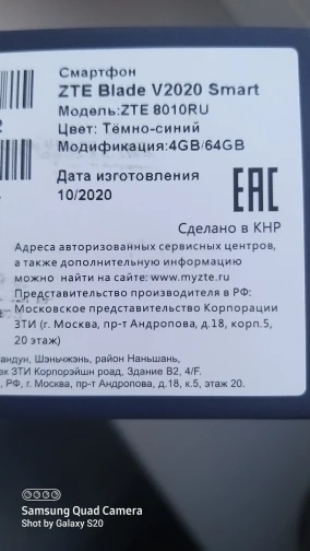 Смартфон ZTE Blade V2020 Smart 464GB Ростест, доставка, новый, официальная гарантия, МегаФон