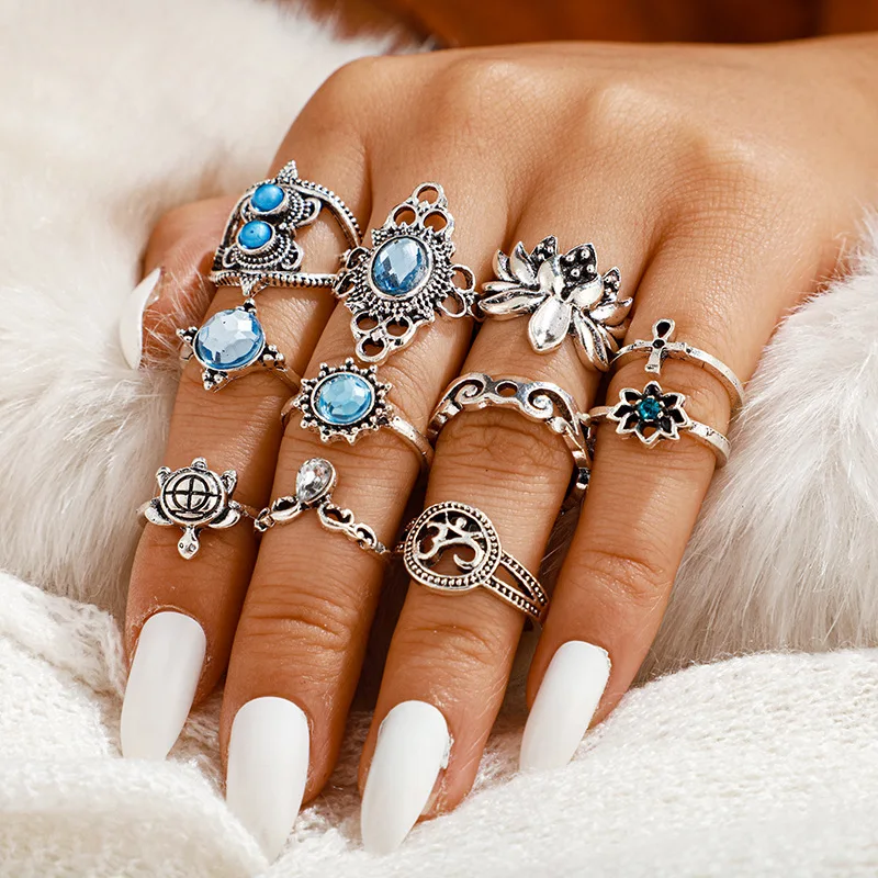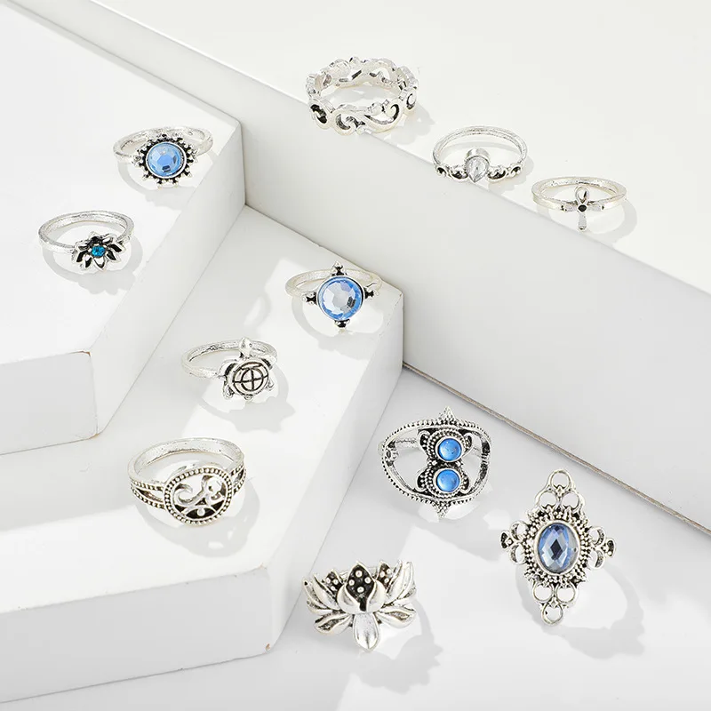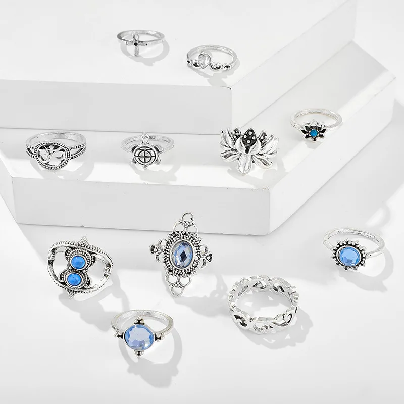 Кольцо в европейском и американском стиле, в стиле бохо, ретро, в национальном стиле, персонализированное, с лотосом, сапфиром, черепахой, комплект из 11 предметов, кольца обещания для пар