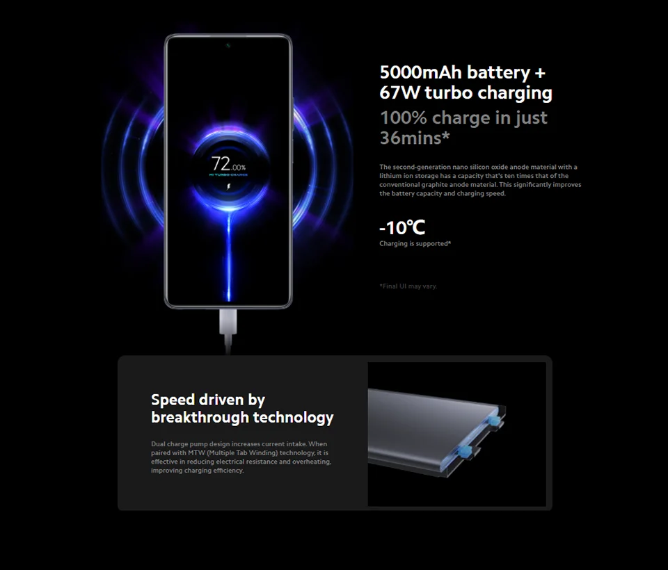 Батарея --------- 5000 мАч (typ) батарея, 67 Вт Проводная турбо зарядка, Встроенный 67 Вт проводное зарядное устройство