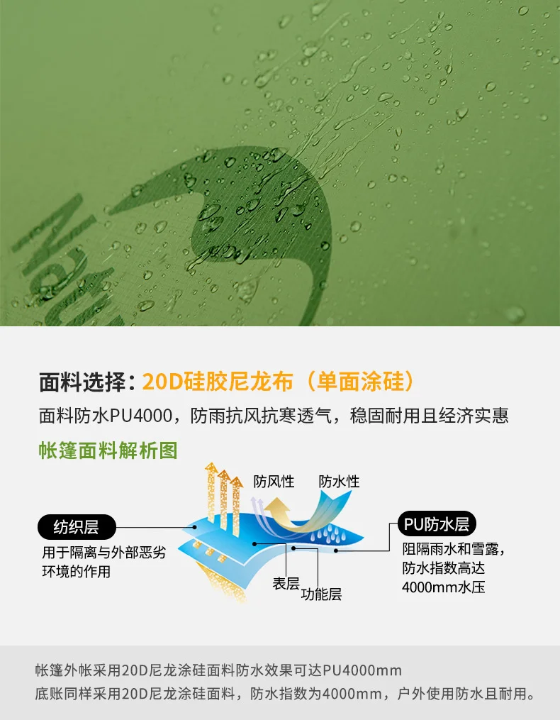 외부 텐트 원단 : 20D 나일론 실리콘 코팅 pu4000mm