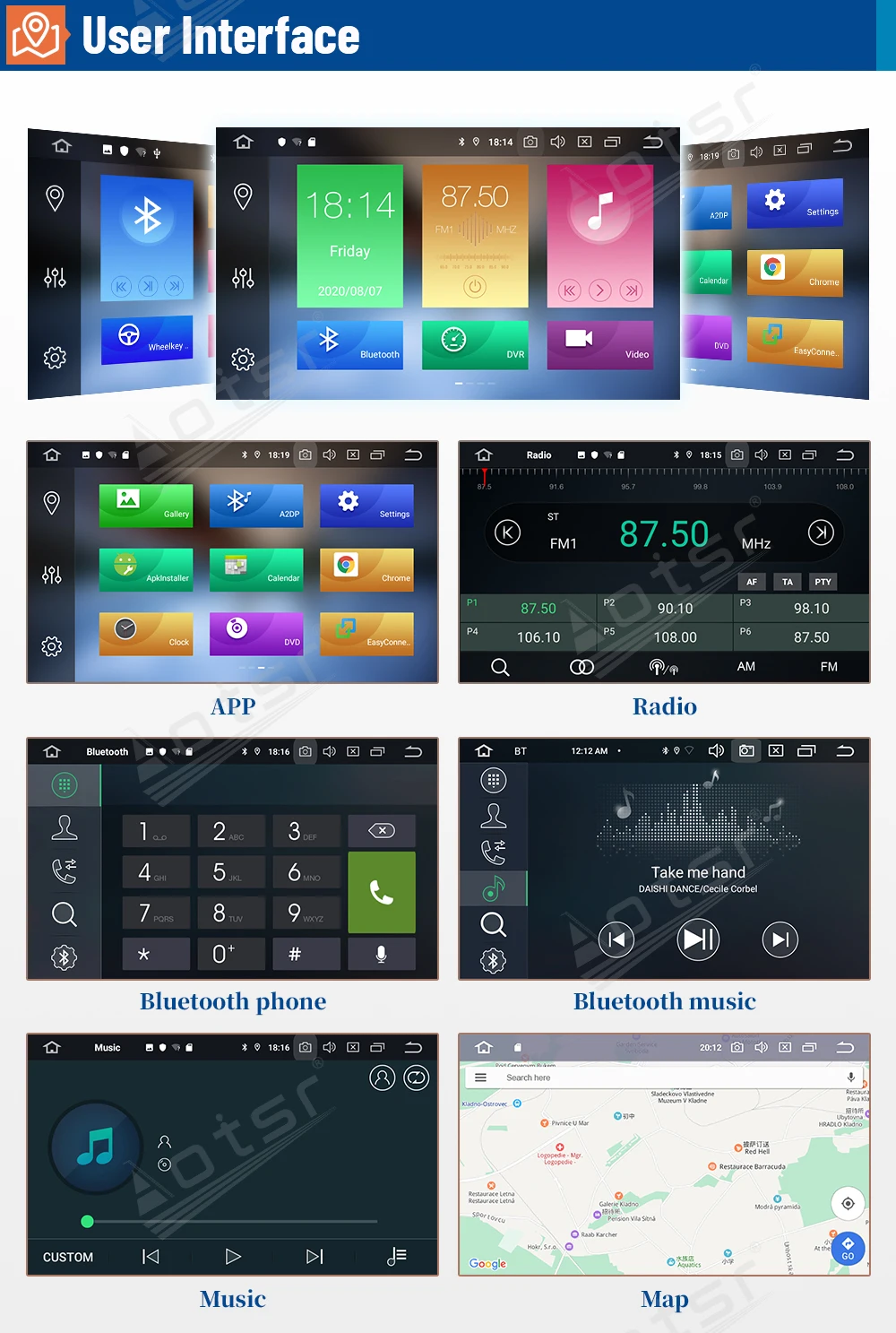 1. Поддержка HD видео Поддержка музыки без потерь2. Встроенный Wifi чип/поддержка сети 3G/4G/5G3. Поддержка загрузки приложений Android и Google play store4. Емкостный сенсорный экран/разрешение HD экран IPS экран5. Встроенная gps-карта и поддержка онлайн-карты, поддержка Google Map. Yandex, Navitel, iGO, Sygic, Tomtom и так далее.6. Поддержка видео: WMV (код VC1) AVI (H.264, MPEG4,Xvid, WMV),MP4 (H.263, H.264, MPEG4), MPG(MPEG-2),M4V(H.264, MPEG4)7.Bluetooth поддерживает все бренды мобильных телефонов, ввод телефонной книги, воспроизведение музыки, Поддержка поиска имени по A-Z8. Поддержка 53 языков: английский/русский/французский/немецкий/испанский/итальянский/арабский/Португальский/Турецкий/тайский/Польский/иврит Все 53 языка.9. Встроенный беспроводной Carplay (опционально)10. Поддержка голосового управления11.Android Auto: может выполнять основные функции смартфона Android и использовать несколько сторонних вечерние приложения через автомобильный развлекательный интерфейс.12. Поддержка зеркальной связи (Android/iPhone)13. Поддержка управления рулевым колесом14. Поддержка AM, FM, RDS радио: AM, FM, RDS, как обработка цифрового сигнала, сохранение и расширение до 30 станций чипсет NXP6686 PHILIPS-высокое качество приема, тюнер помещается в оригинальные радиомашины премиум-класса.15. Подключи и работай