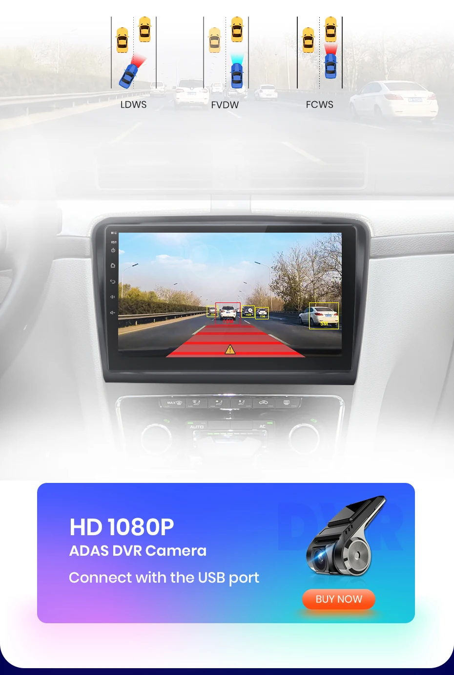 Когда автомобильное радио подключено к ADAS video recorder, это сделает передовую систему помощи при вождении, И предупредит вас, если ваш автомобиль слишком близко к переднему автомобилю или если ваш автомобиль отклоняется от полосы движения, чтобы помочь вашему вождению безопаснее и проще.