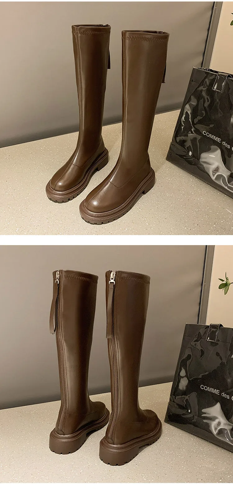 Женские длинные Сапоги из искусственной кожи на низком каблуке, высокие Сапоги до колена, женская обувь на платформе без застежек, Осень-Зима, женские Сапоги размера плюс 43