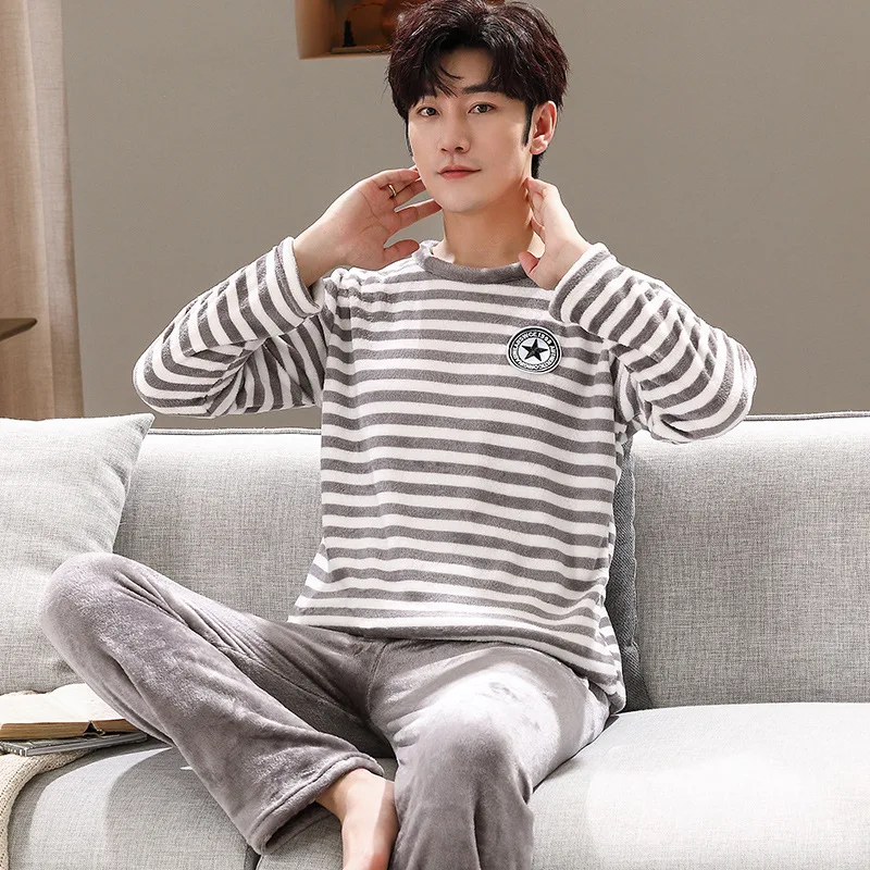 Зимние теплые пижамы для мужчин, пижамные комплекты в полоску, мужс...