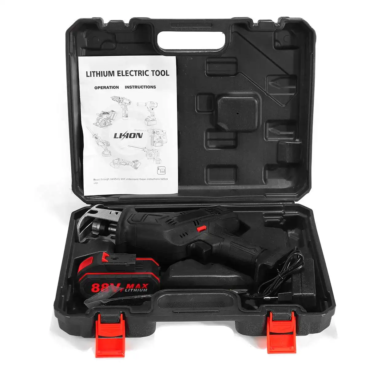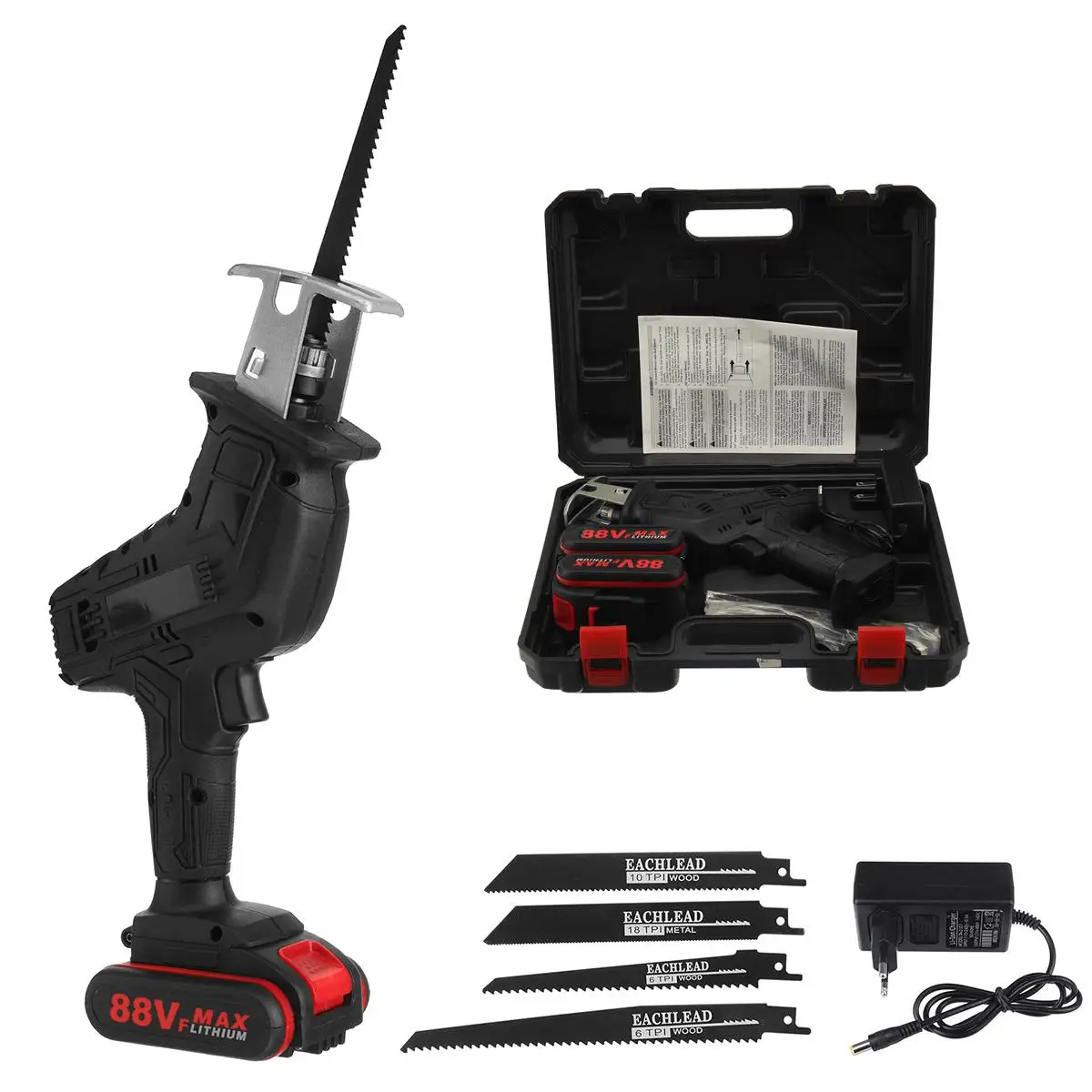 Особенности1. Мощный двигатель. 88в Аккумулятор для мощного, контролируемого, быстро режущего по дереву, трубам и металлам.2. Свободное изменение лезвия. Вы можете быстро сворачивать и заменять лезвия без использования каких-либо дополнительных инструментов.3. Триггер переменной скорости. С защитной функцией блокировки.4. Компактный дизайн. Светильник для удобного захвата. Компактный корпус обеспечивает мощную энергию.5. Светодиодный светильник. Удобно использовать в темноте или ночью.