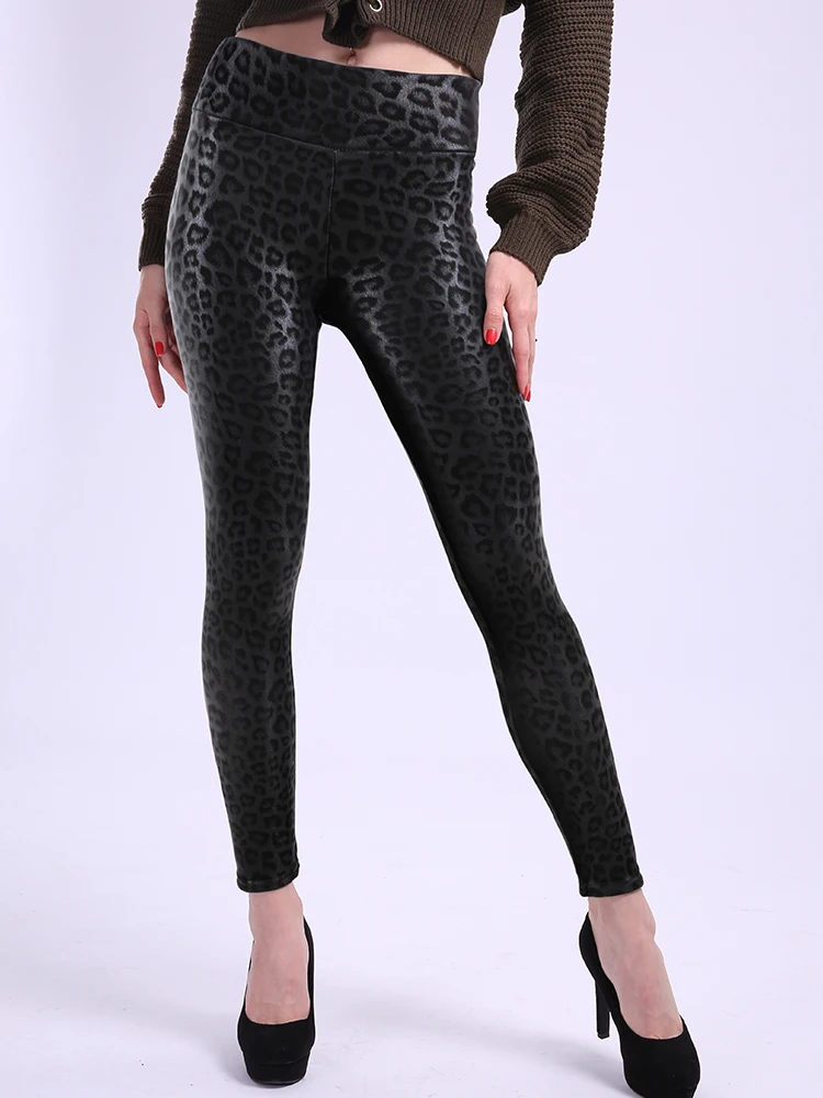 Женские кожаные леопардовые леггинсы CHRLEISURE, теплые тонкие черные леггинсы из искусственной кожи с принтом, бархатные зимние эластичные леггинсы