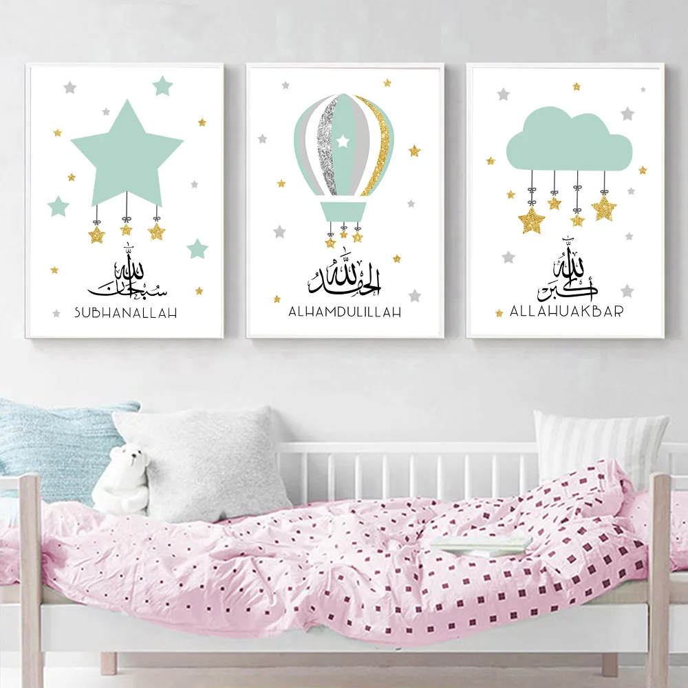 Мусульманский плакат с зелеными золотыми звездами, настенный плакат с воздушным шаром, художественный принт для детской комнаты, Картина на холсте в скандинавском стиле, домашний декор для детской комнаты