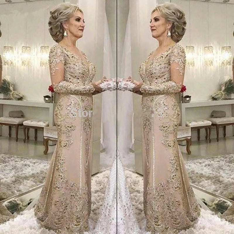 Платье для матери невесты цвета шампанского, с V-образным вырезом и длинным рукавом, в пол, кружевные вечерние платья с аппликацией и блестками для свадебной вечеринки, 2021