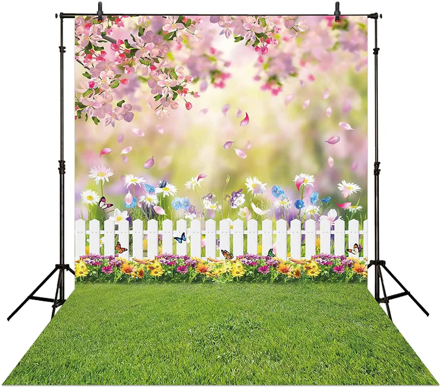 Фон для фотографирования с изображением весеннего пасхального сада зеленой травы газона розовых цветов бабочки забора