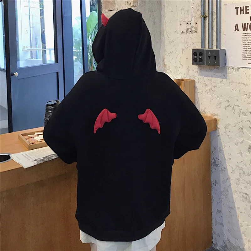 Harajuku толстовки с капюшоном для девочек, готические толстовки с капюшоном с изображением маленького дьявола, женские свободные пуловеры с карманами, топы, уличная одежда