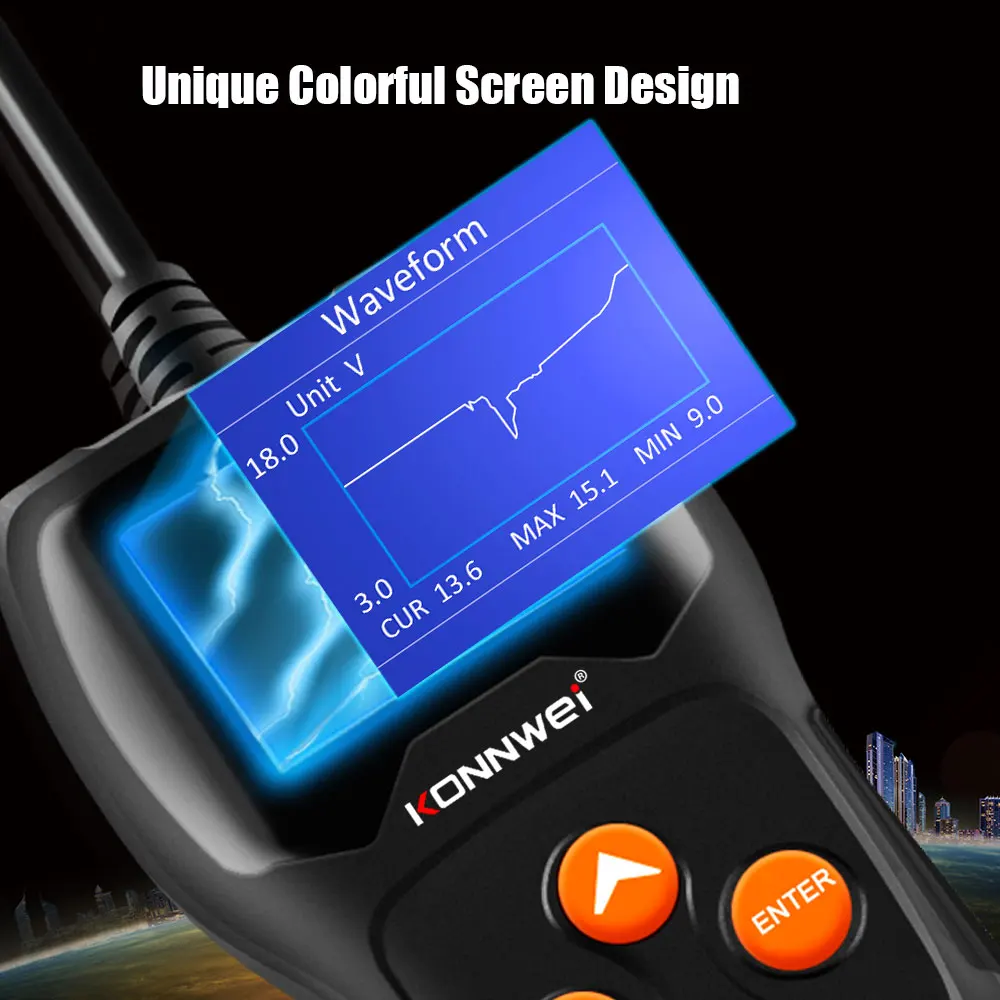 KONNWEI KW600-это новейший тестер батарей, Модернизированный от старого классического тестера с подсветкой на рынке, направленный на быструю и точную проверку состояния аккумулятора, а также проверку рабочего состояния генератора. Это профессиональный диагностический инструмент для проверки проблем с системой батареи с помощью графического инструмента контроля напряжения, с его цветным экраном и уникальным дизайном рисунка, пожизненное бесплатное обновление, KONNWEI KW600-это идеальный инструмент для тестирования батареи для вашей работы и семьи.