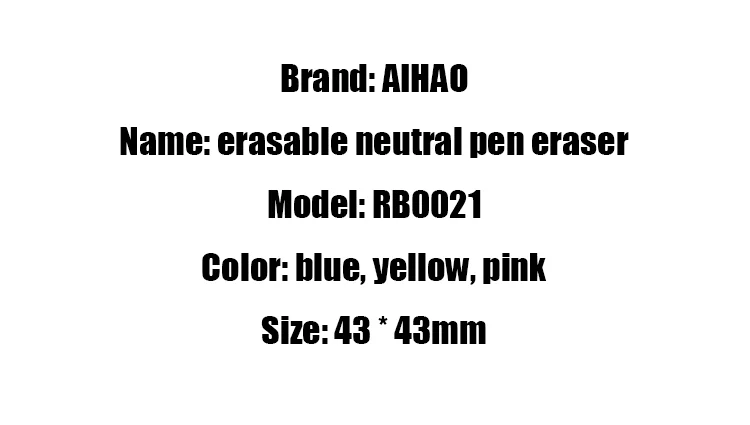Бренд: AIHAOНазвание: стираемая нейтральная ручкаМодель: RB0021Цвет: синий, желтый, розовыйРазмер: 43*43 мм