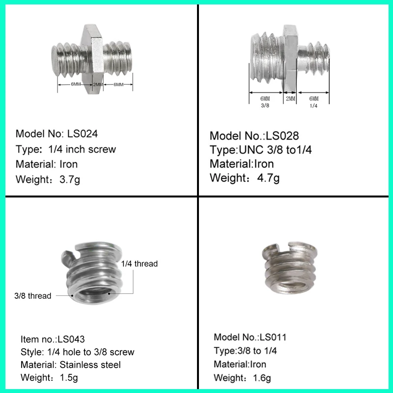 Тип изделия: винты адаптера Материал: металл Размер: как показано Цвет: серебристый + золотой + черный Количество: 1 комплект (22 шт.) Подходит для кронштейна, штатива, монопода, нижнего отверстия камеры.