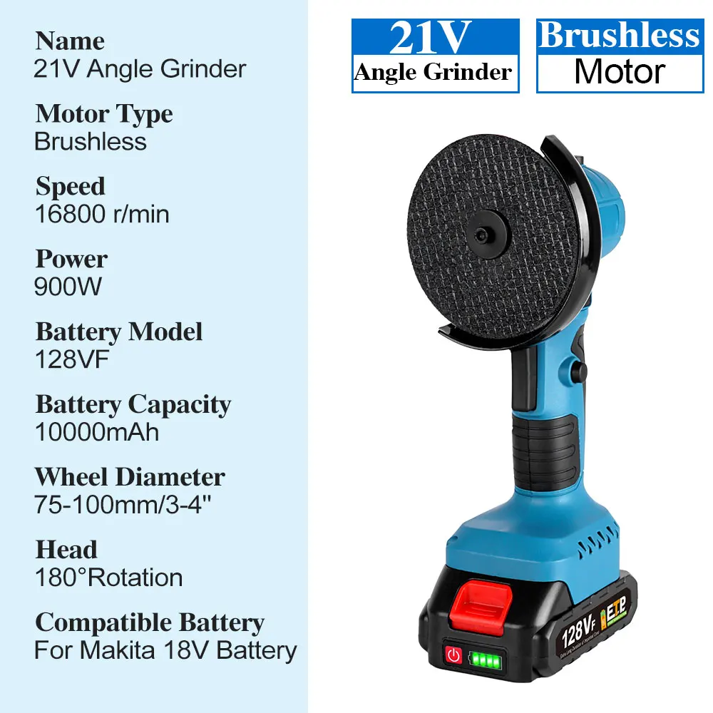 Беспроводная угловая шлифовальная машина, 21 в, 900 Вт