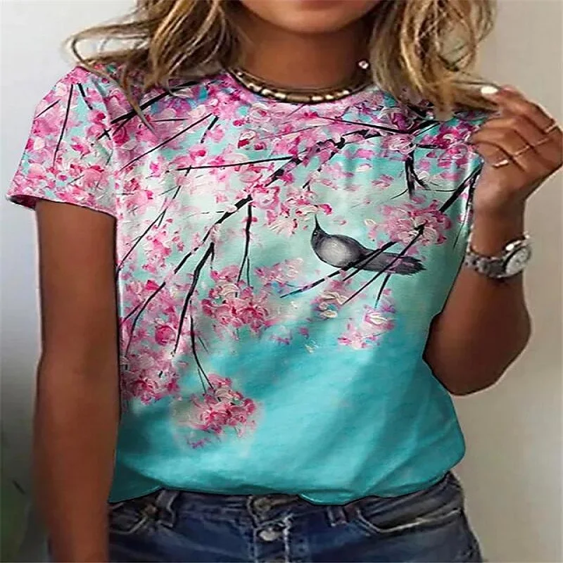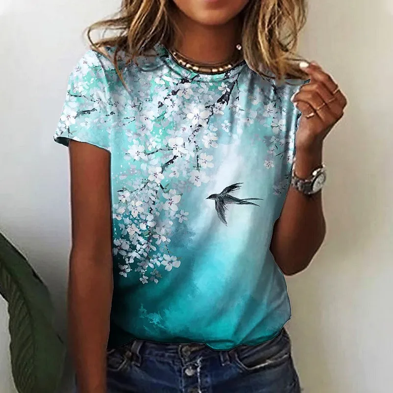 Уличная одежда, Женская тканевая блузка с круглым вырезом, футболка большого размера, женская одежда, женская рубашка в новом стиле с короткими рукавами и цветами