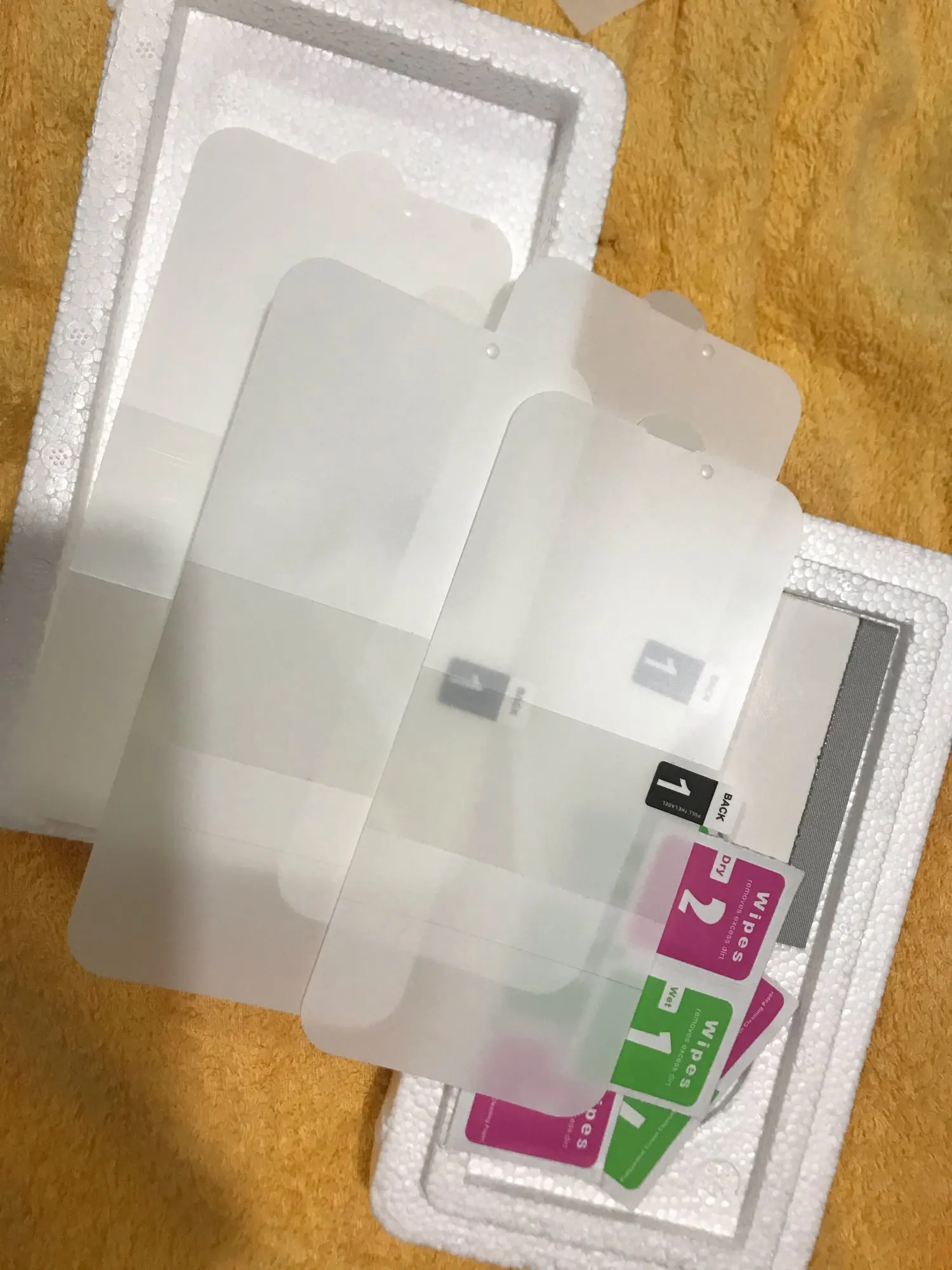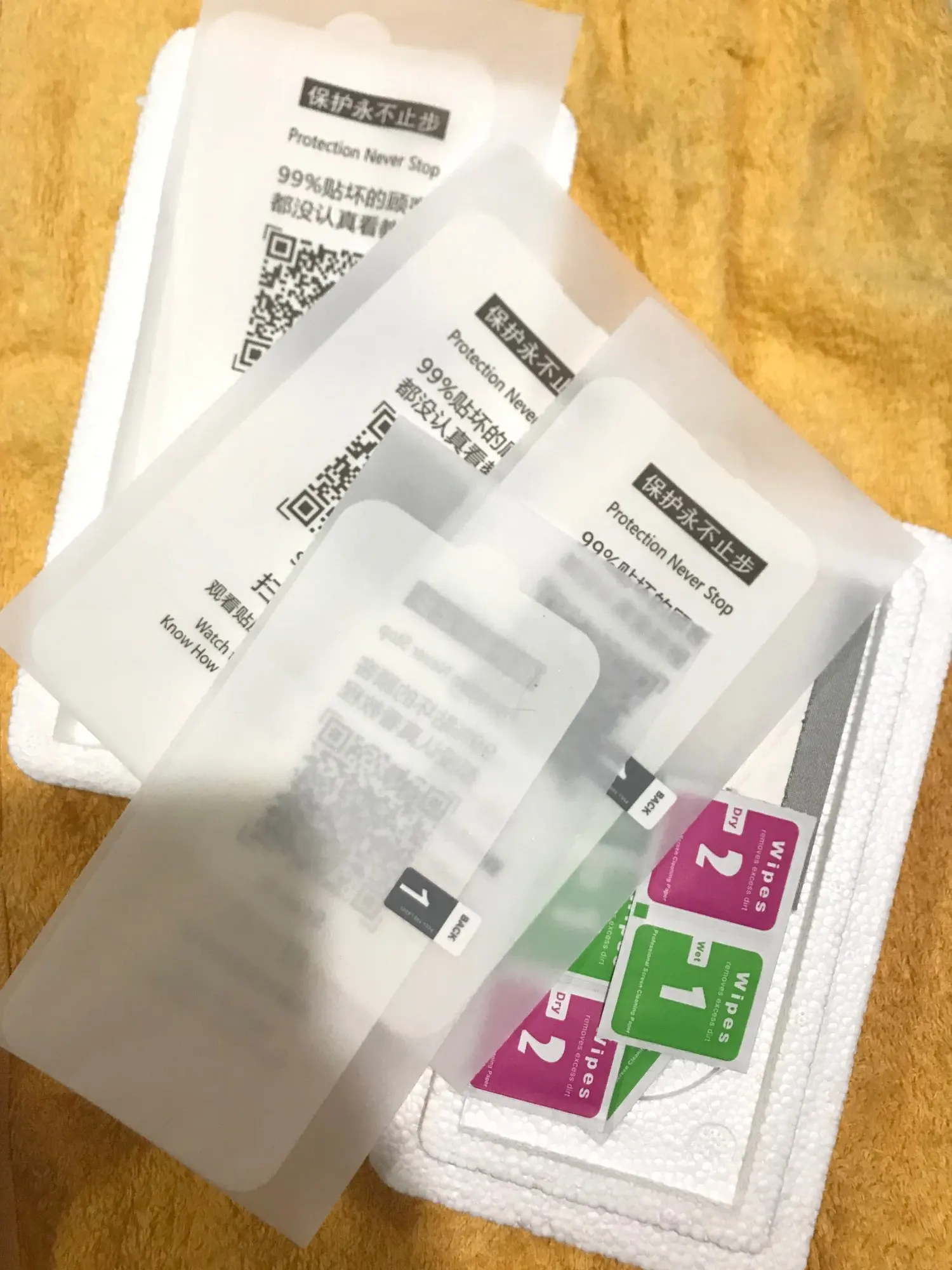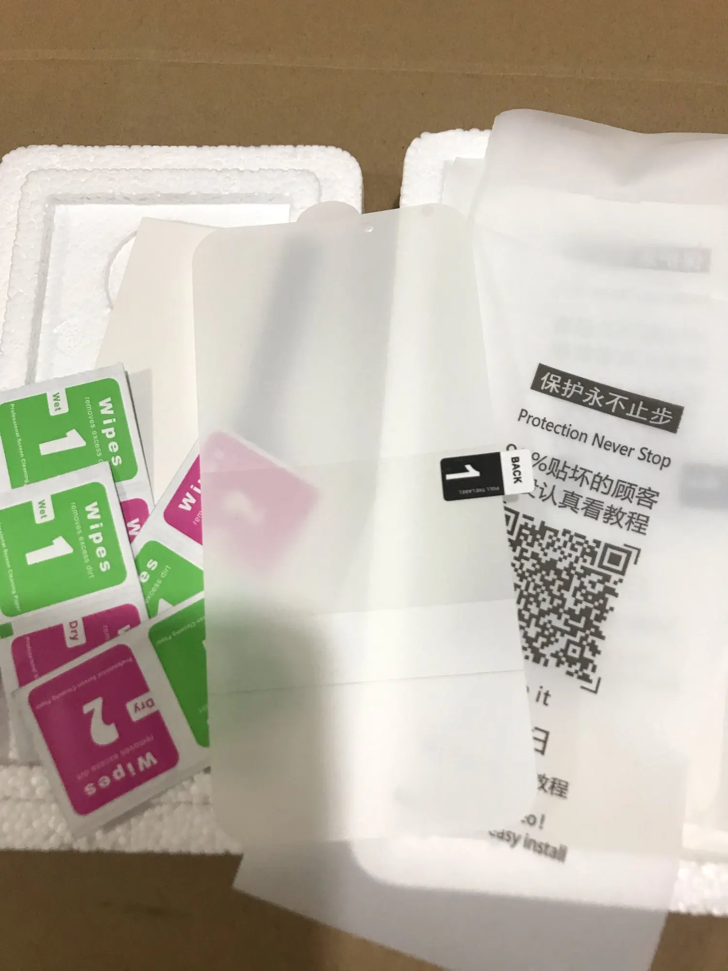 Все было хорошо упаковано в пенопласт. Доставка не долгая. Плешки у меня в наборе было 4, плюс к каждой пленке идут тряпочки(1,2). Клеится быстро, остаются маленькие пузырики, но через пару дней они исчезают, пленке растекается до конца по экрану. На телефоне не заметна по сравнению с защитным стеклом.