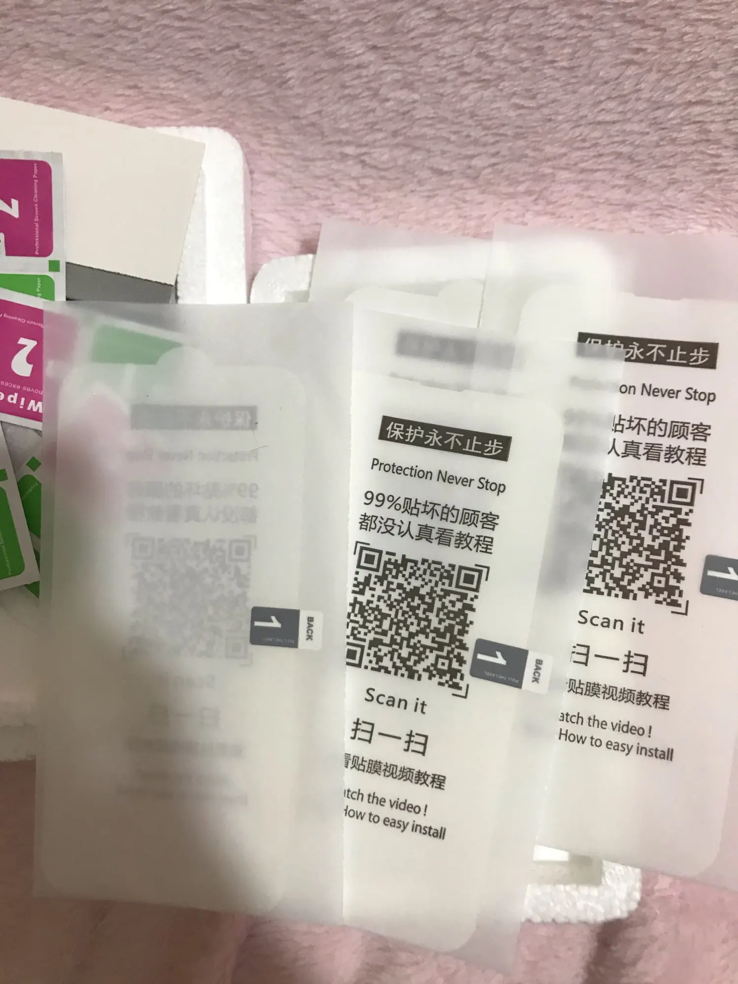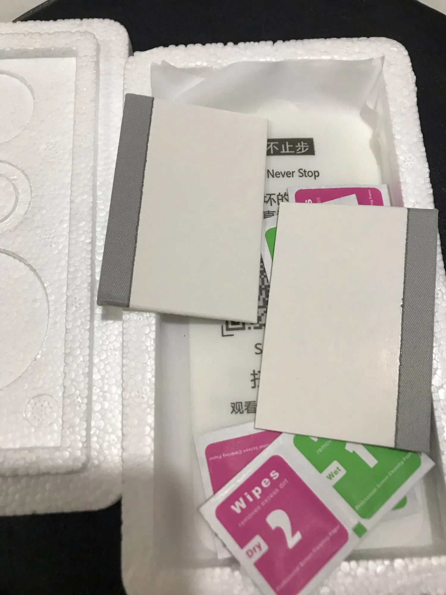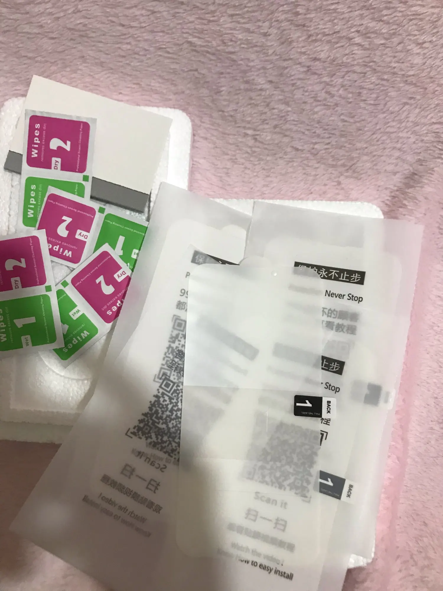 Все было хорошо упаковано в пенопласт. Доставка не долгая. Плешки у меня в наборе было 4, плюс к каждой пленке идут тряпочки(1,2). Клеится быстро, остаются маленькие пузырики, но через пару дней они исчезают, пленке растекается до конца по экрану. На телефоне не заметна по сравнению с защитным стеклом.