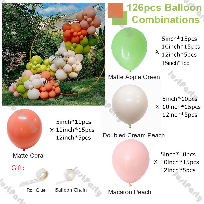 126 шт (12 футов)Шар гирлянда Арка Упаковочный лист:Матовый Apple Green (5 дюймов * 15 шт., 10 дюймов * 15 шт., 12 дюймов * 5 шт., 18 дюймов * 1 шт.)Крем-персик в два раза (5 дюймов * 10 шт., 10 дюймов * 15 шт., 12 дюймов * 5 шт.)Макарон персиковый (5 дюймов * 10 шт., 10 дюймов * 15 шт., 12 дюймов * 5 шт.)Матовый Коралл (5 дюймов * 10 шт., 10 дюймов * 15 шт., 12 дюймов * 5 шт.)Бесплатно: 1 рулонный клей (100 шт.)Воздушная цепь * 1(5 м)
