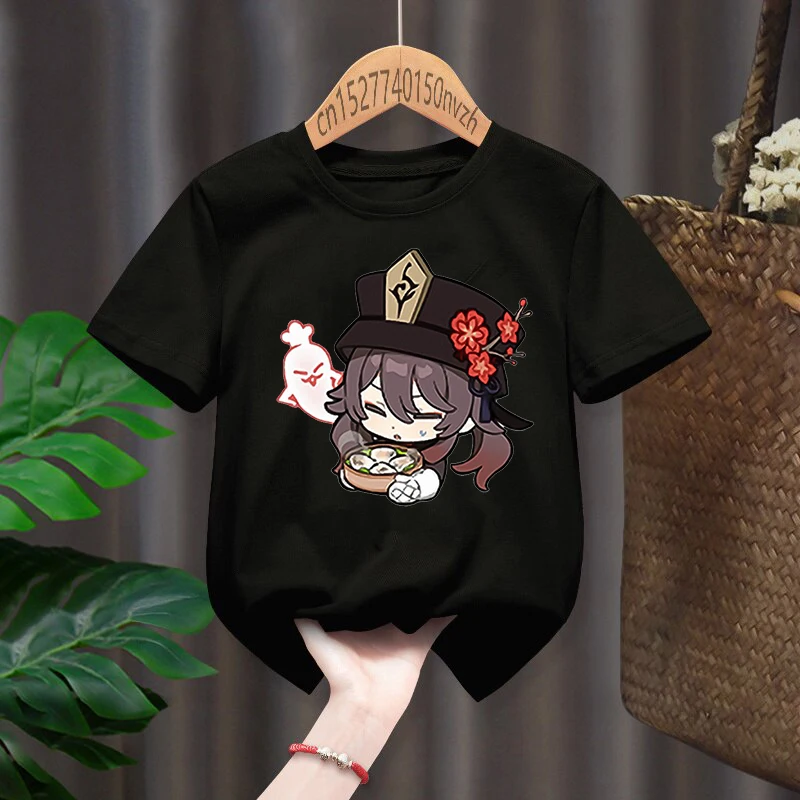 Hu Tao Genshin ударный принт красная фотография детский черный Харадзюку кавайная одежда топы для мальчиков и девочек подарок, Прямая поставка