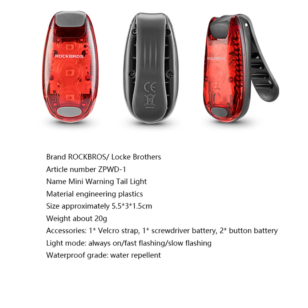 Подробная информация о продукте:Бренд: ROCKBROSНазвание: мини-предупреждающий задний светильникМатериал: инженерный пластикРазмеры: около 5,5*3*1,5 смВес: около 20 гАксессуары: 1 * ремешок на липучке, 1 * отвертка, Батарея: 2 * Кнопочный Аккумуляторный светильникРежим: всегда ВКЛ./быстрое мигание/медленное мигание, нажмите, чтобы переключить режимВодонепроницаемыйУровень: водонепроницаемый в том случае, если вы обнаружите, что хвост светильник не светильник со шнуровкойПосле получения продукта, пожалуйста, откройте место, где находится аккумуляторУстановлен и проверьте, есть ли изоляционная пленка. Это нормальноСнимите изоляционную пленку.
