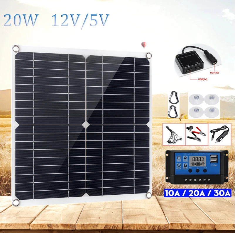 Панель Солнечная водонепроницаемая, 20 Вт, 5 В, 12 В постоянного тока, с контроллером 102030 А