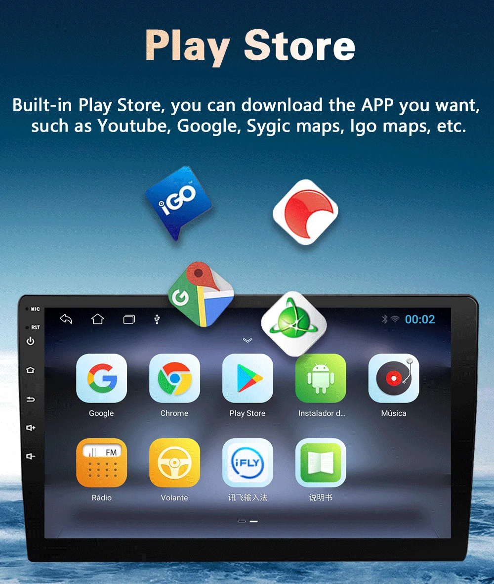 Встроенный Play Store, вы можете загрузить нужное вам приложение, например Youtube, Google, Sygic maps,Google и т. д.