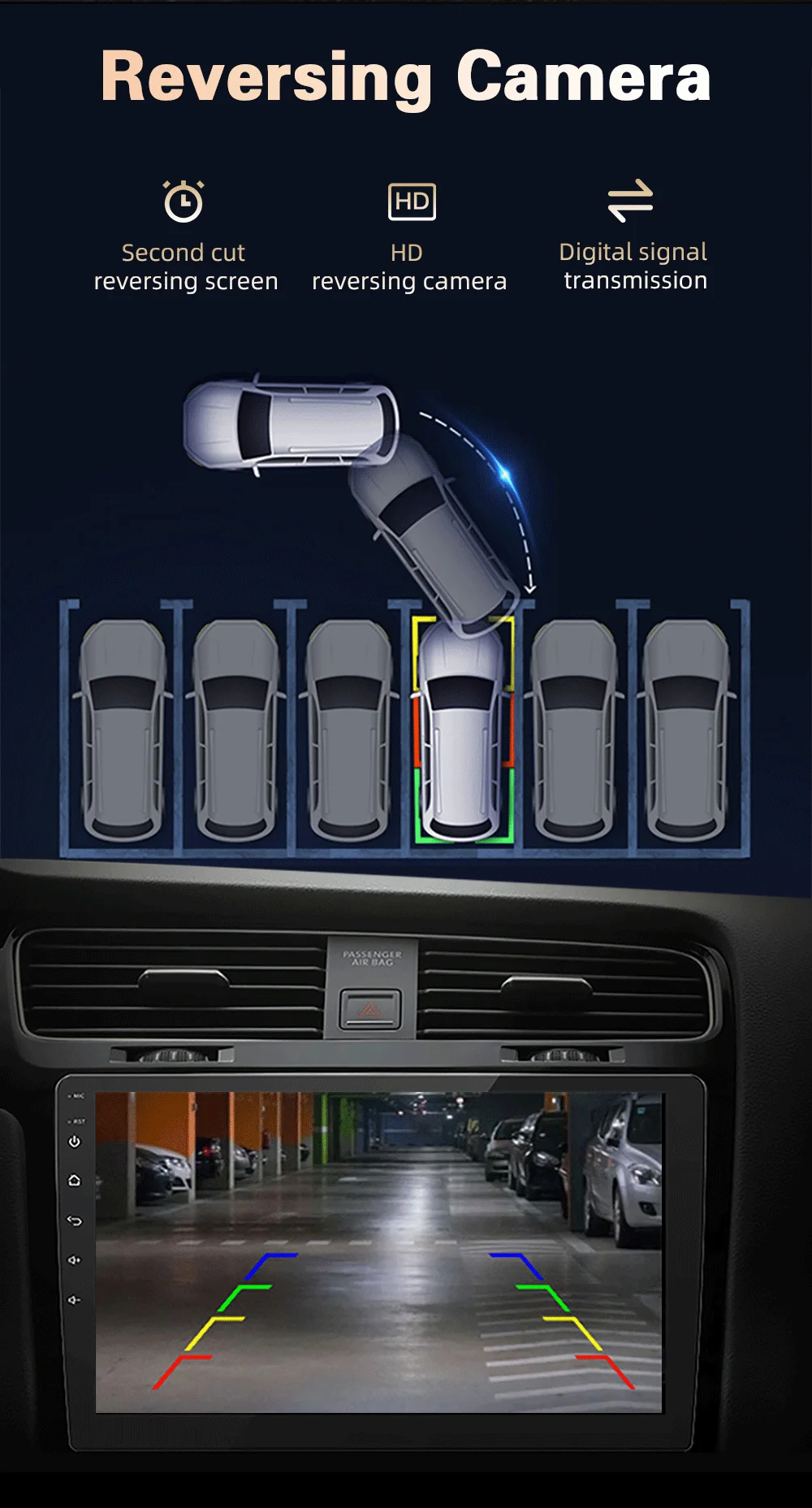 Когда обратная передача включена, этот проигрыватель Android автоматически переключается на обратный экран. В соответствии с версией, которую вы купили, будет представлена камера HD 8 огней или камера заднего вида AHD