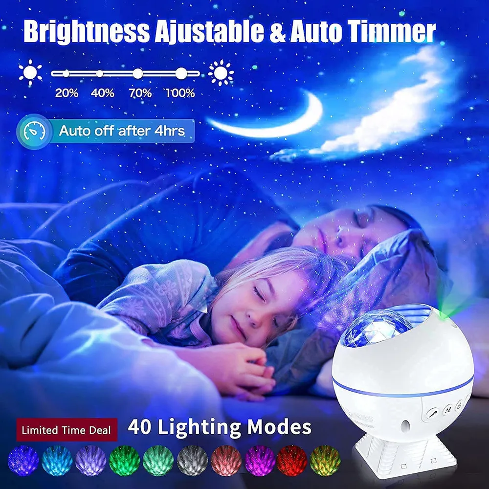 【 3 в 1 Космические Огни Галактическое ночное освещение 】Этот последний Звездный проектор имеет 40 светильников, океанические волны, встроенную луну с проекцией облаков и 500 + звезд съемки. Вы можете выбрать один из четырех цветов или смешать два цвета произвольно и настроить динамическую Скорость Волны океана.
