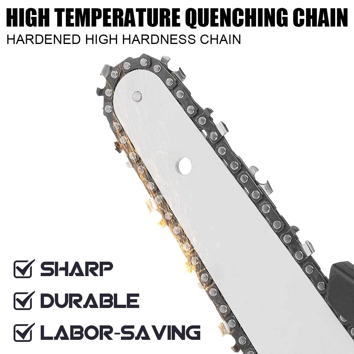 Особенности:-Острая и прочная цепь: Высококачественная цепочка из сплава, износостойкая и прочная, быстрая и гладкая распиловка без помех.-Широкое применение: Эта электрическая бензопила имеет широкий спектр применения, используется для резки леса, резки дерева, обрезки веток и так далее.-Бесщеточный Медный двигатель: сильная мощность, более стабильная выходная мощность, чем цепная пила, Модифицированная угловым шлифовальным станком. Высокая нагрузка, так что не может легко сгореть.-Портативный дизайн: мягкая резиновая ручка, противоскользящая и поглощающая пот; Расширенная конструкция перегородки, чтобы предотвратить брызги щепы во время резки; Конструкция отверстия для рассеивания тепла, эффективная вентиляция и рассеивание тепла.