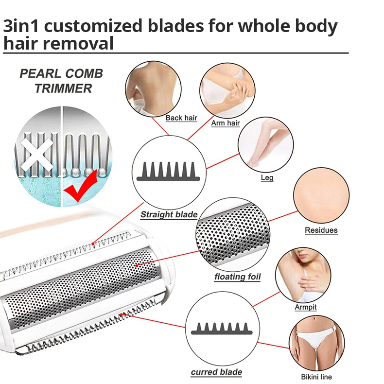 ---- 3 в 1Лезвия: 3 лезвия эффективно и полностью удаляют Волосы на теле. CЛезвие для подмышек и линии бикини; Плавающая фольга для остаточных коротких волос; Прямое лезвие для рук и ног.