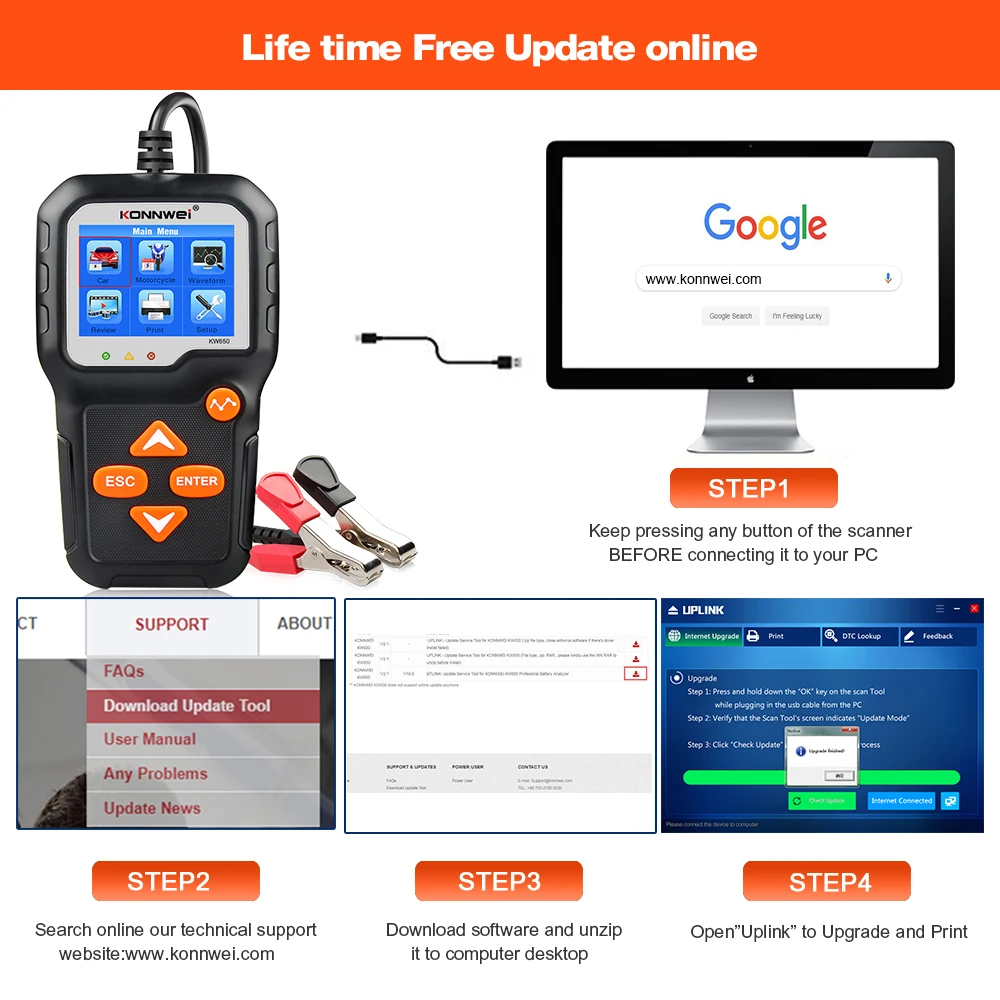 Тестер автомобильного аккумулятора KONNWEI KW650, 100-2000CCA, тестер напряжения запуска для автомобилейлодокмотоциклов, автомобильный диагностический инструмент