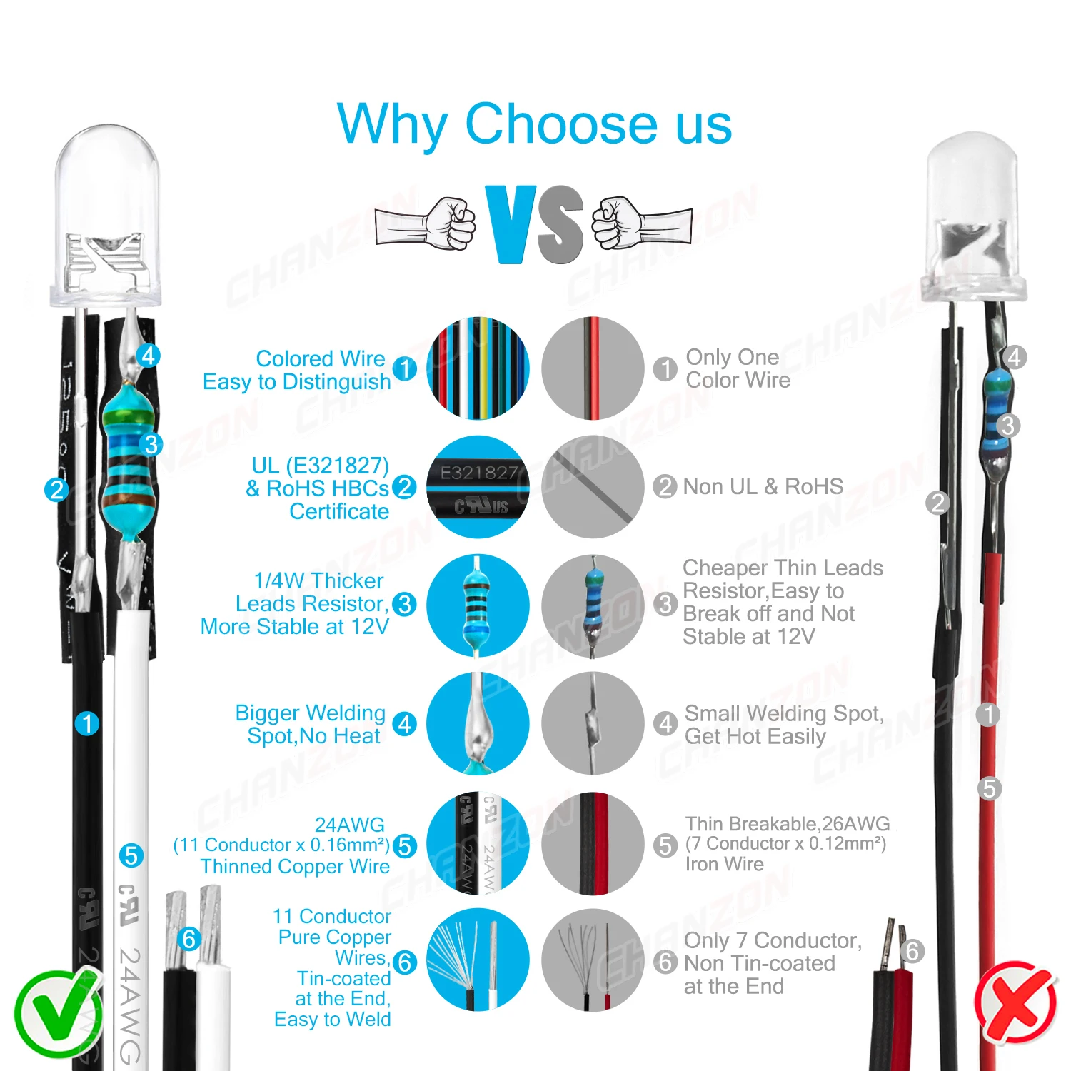 Цвет излучения: теплый белый/красный/зеленый/синий/желтый/оранжевый/УФ/розовыйТок: 20 мАНапряжение: 12 В (его также можно использовать с 3-12 В для различных целей яркости)Полярность: анод (цветной провод) | Катод (черный провод)Интенсивность света: см. Изображение спецификации
