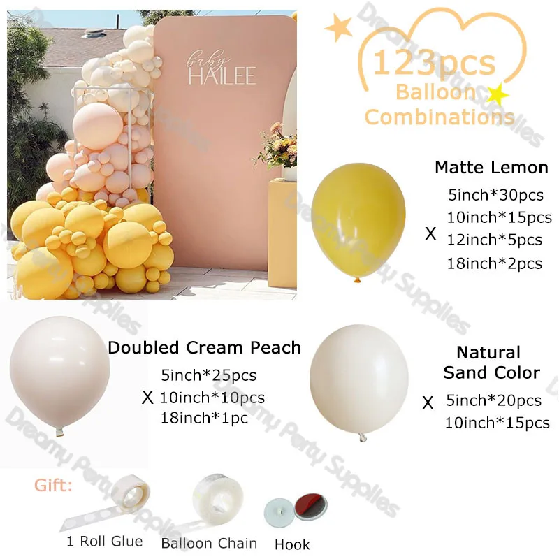 Матовый лимон (5 дюймов * 30 шт., 10 дюймов * 15 шт., 12 дюймов * 5 шт., 18 дюймов * 2 шт.) Естественный цвет песка (5 дюймов * 20 шт., 10 дюймов * 15 шт.) Крем-персик в два раза (5 дюймов * 25 шт., 10 дюймов * 10 шт., 18 дюймов * 1 шт.) Подарок для вас: 5 м цепочка на воздушный шар * 1 Воздушный шар Клей * 100 Крючок * 3