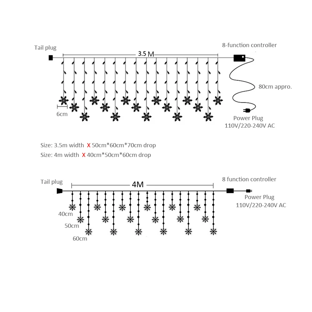 Название продукта: снежинка сосулькаЦвет: теплый белый/цветной/белый/синий/розовый/синий/зеленый/красныйРазмер ламп: 3,5 м 96LED 16 струн падения, 4 м 96 светодиодов 19 струн падения.Рабочее напряжение: 110 В переменного тока 220 В переменного токаРазъем питания: 110 В (вилка стандарта США), 220 В-240 В (вилка стандарта ЕС/Великобритании/Австралии)Расстояние от вилки питания до лампы составляет около 80 см в длину.Материал: медная проволока и прозрачная проволока, внутренняя и наружная использование.Снежинка сосулька светится с хвостовой вилкой, так что вы можете подключить 2 струны вместе, максимальная серия 8 струн.