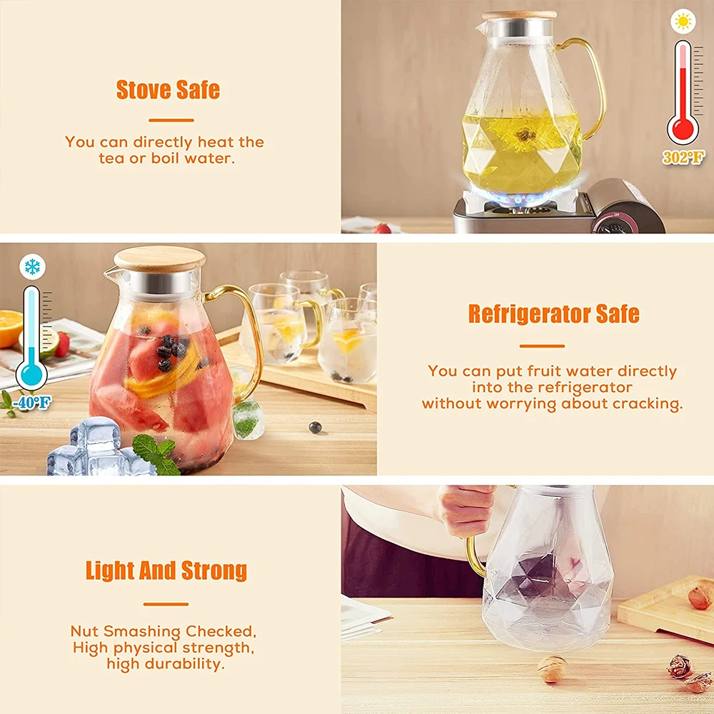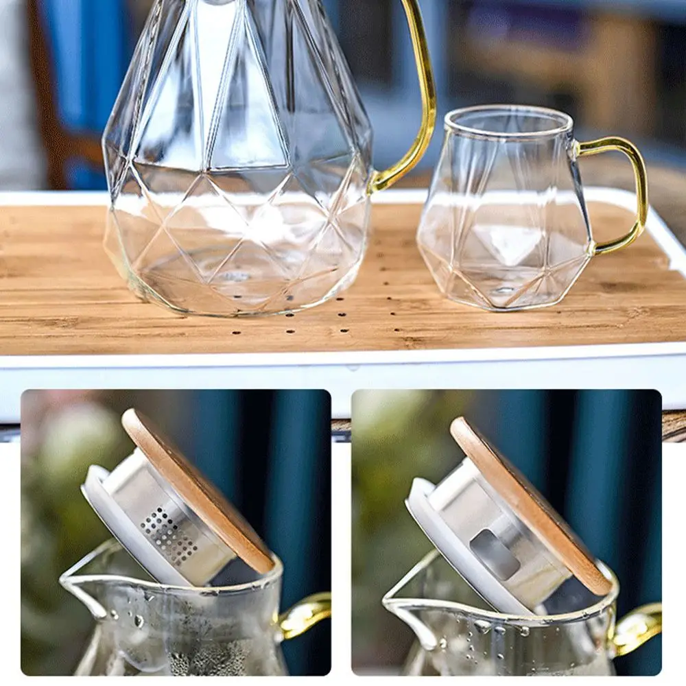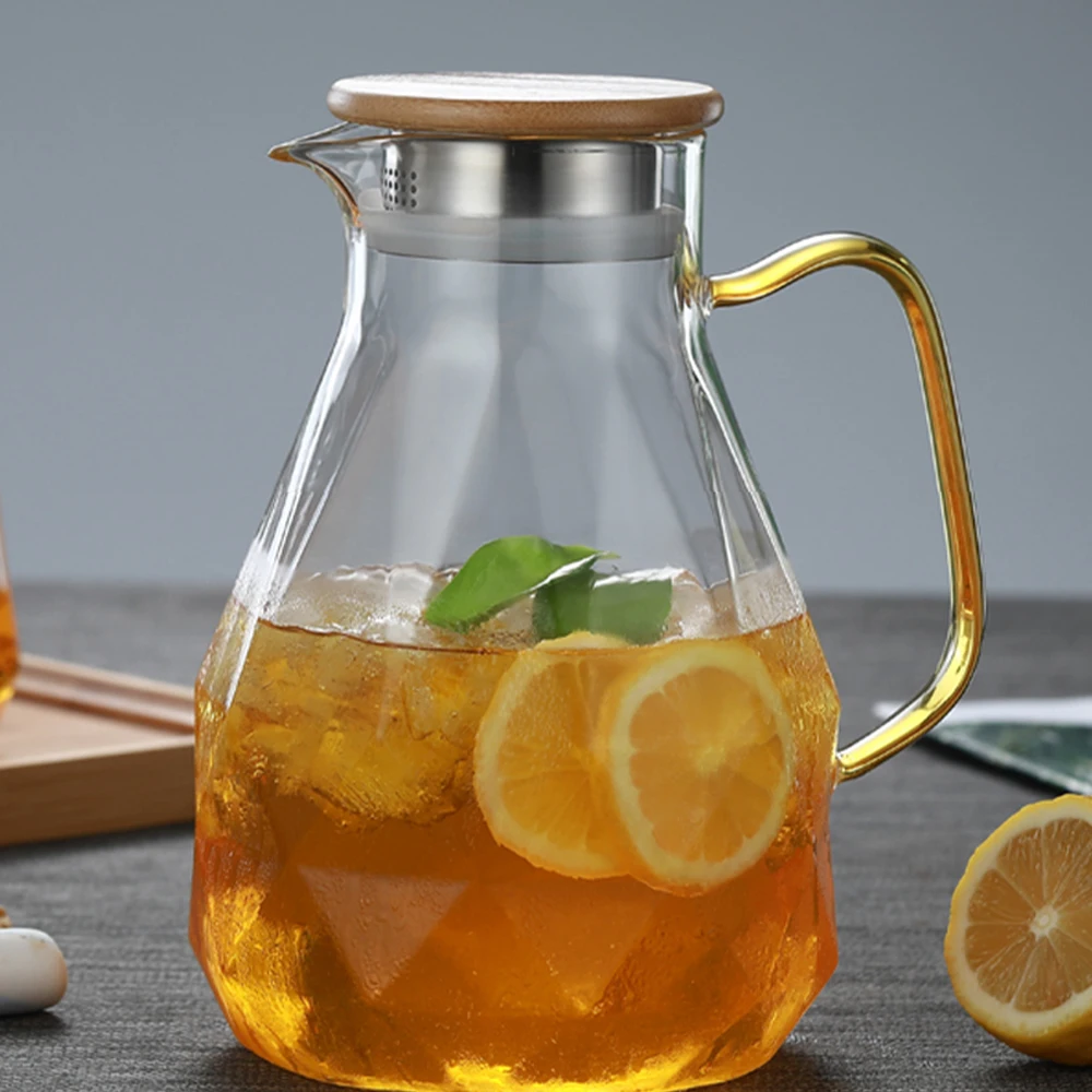 Особенности: -- Специальный стеклянный материал имеет низкое расширение, высокую прочность, высокую твердость, высокий светильник и высокую химическую стабильность. Этот чайник устойчив и безопасен в использовании. -- Продукт может быть не только заполнен холодной водой, но и нагревается открытым огнем, прост в использовании. -- Изготовлено из нержавеющей стали марки 304, двухсторонний фильтр может эффективно фильтровать воду для удовлетворения потребностей различных сезонных напитков. -Уникальный дизайн привлекает внимание и делает питьевую воду приятной. -Большая вместимость, идеально подходит для семейного использования. -- С широким отверстием, вы можете легко очистить его. -- Стеклянный чайник принимает двойное Силиконовое кольцо для уплотнения, максимально сохраняет свежесть.