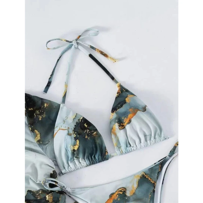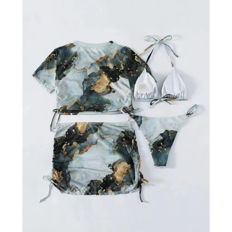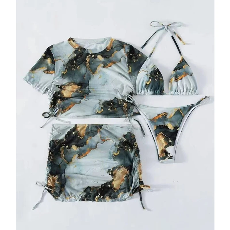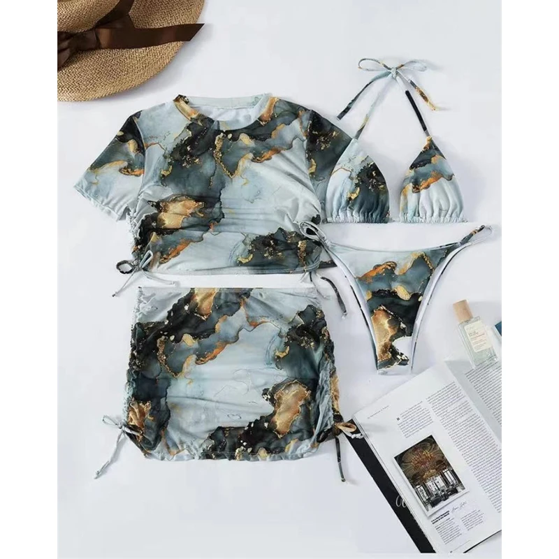Сексуальный женский комплект бикини из 4 предметов с юбкой, с мраморным принтом, купальник с коротким рукавом, пляжная одежда 2021, купальные костюмы