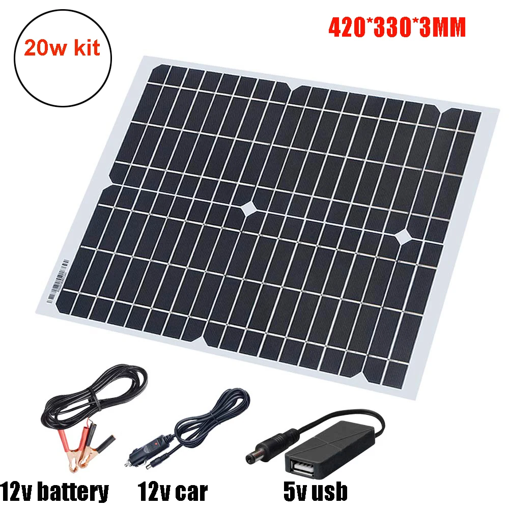 1. 1*20 Вт солнечная панель2. 1 * DC + крокодил кабель3. 1 * DC + кабель прикуривателя4. 1 * usb Солнечный Кабель5. 1*12V 10A контроллер (опционально)