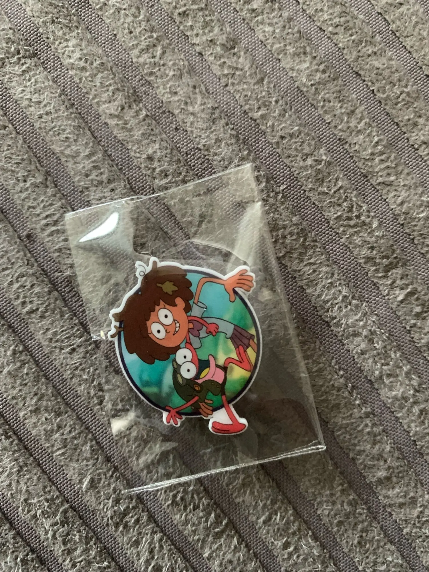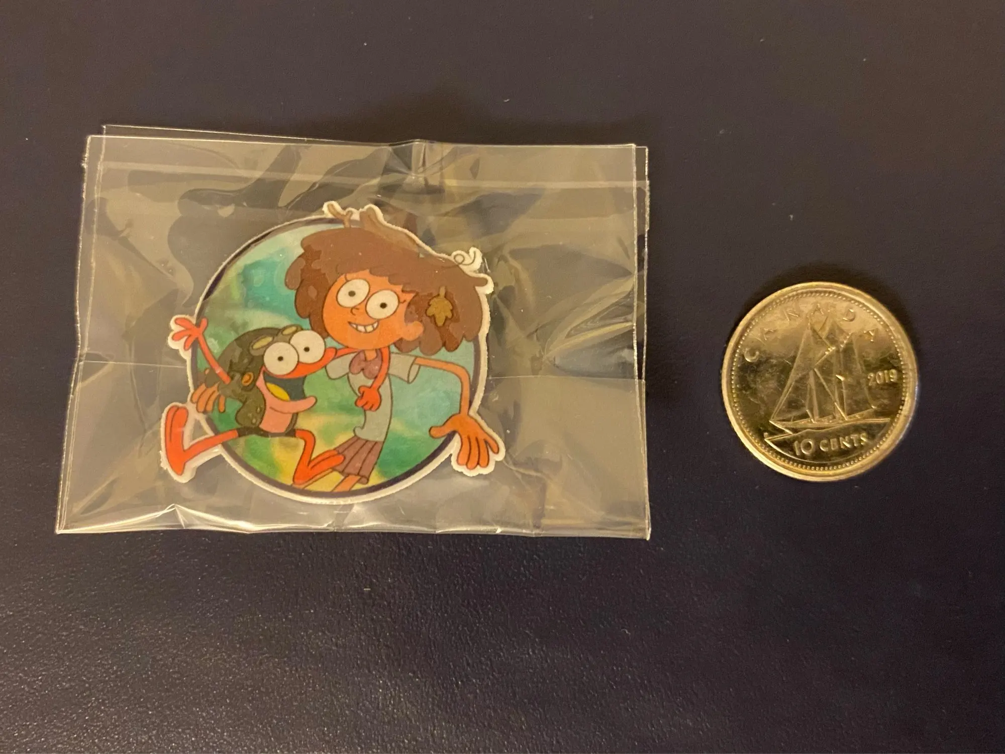 Соответствует картинке, хороший, яркий и качественный значок. Племяннице 9 лет, этот мультсериал смотрит, ей понравилось.