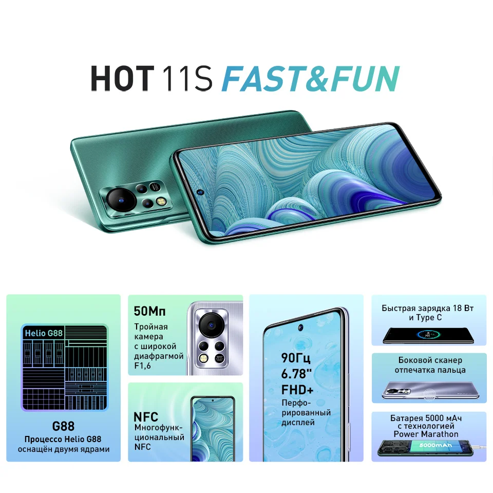 Cмартфон Infinix HOT 11S 4+64GB Helio G88 NFC Быстрая Зарядка 18 Вт 50 МП 6,78 FHD+ Доставка из Москвы Официальная Гарантия