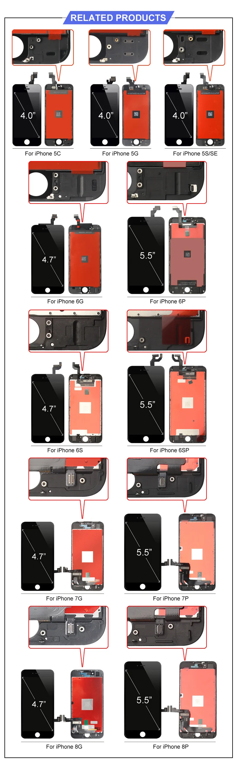 1.100% новый и никогда не использовался ранее, запасная часть ЖК-экрана для iPhone 5G / 5C / 5S / 5SE / 6P / 6S / 6S / 6SP / 7 / 7P / 8 / 8P