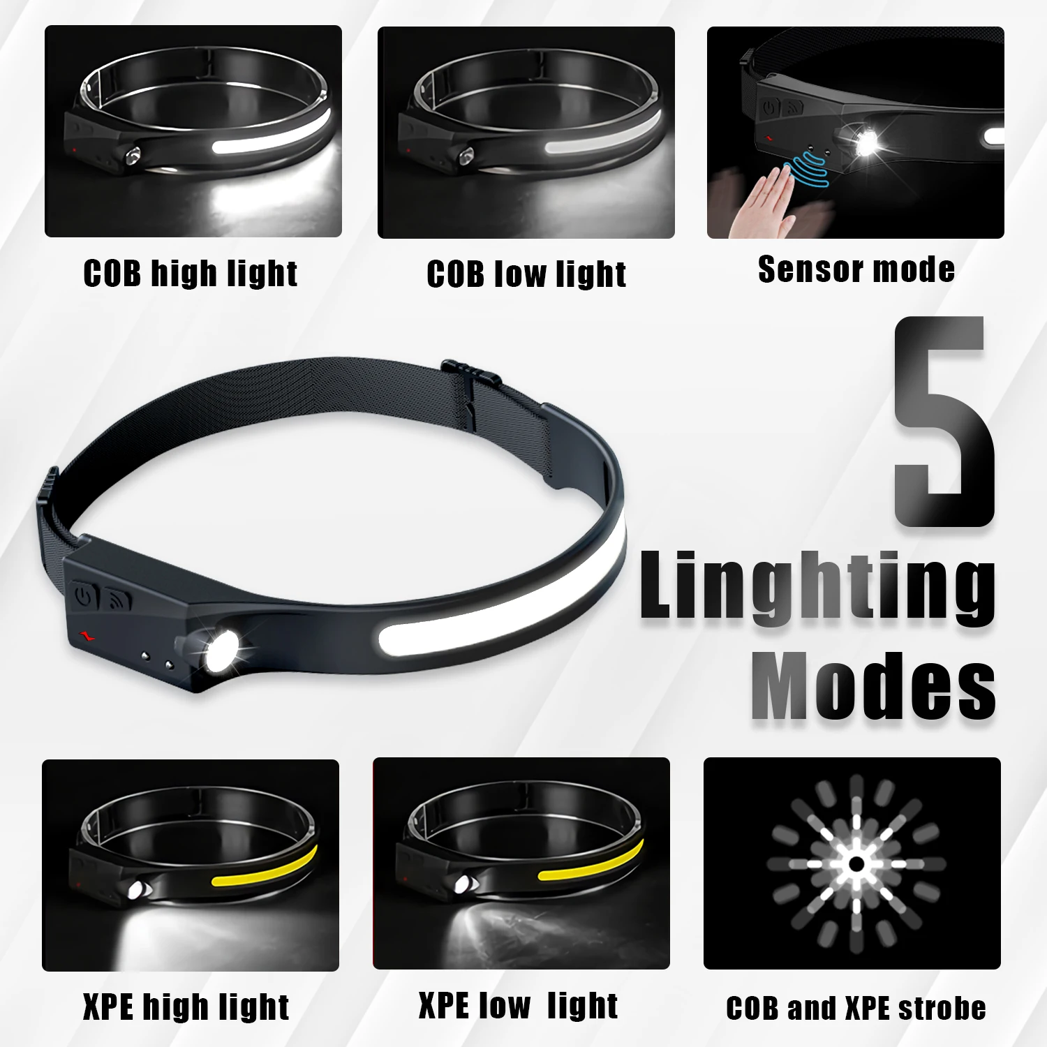 Светодиодный головной фонарь COB с датчиком и встроенным аккумулятором, головной фсветильник рь с USB-зарядкой, 5 режимов освещения, светильник