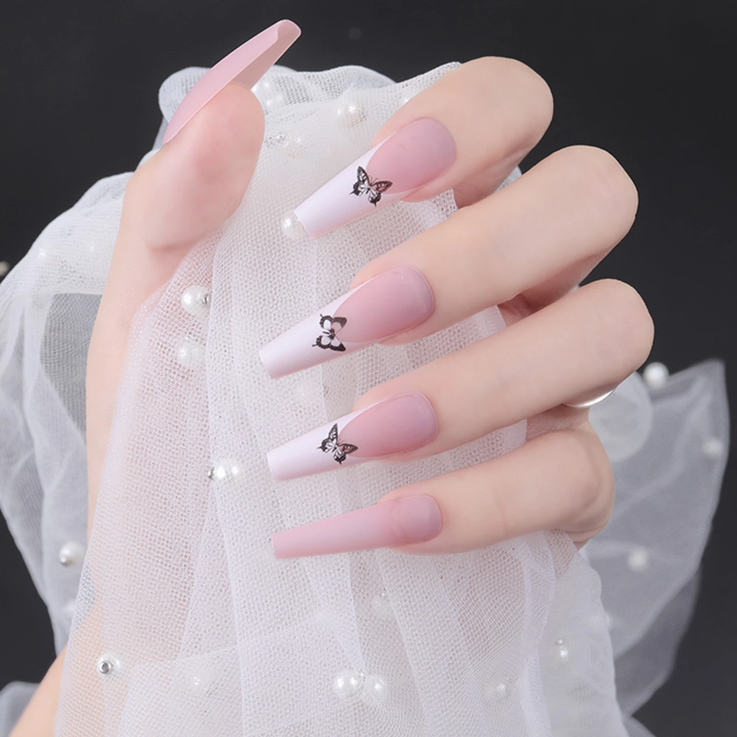 24 шт., накладные ногти с рисунком розовой бабочки, Длинные француз...